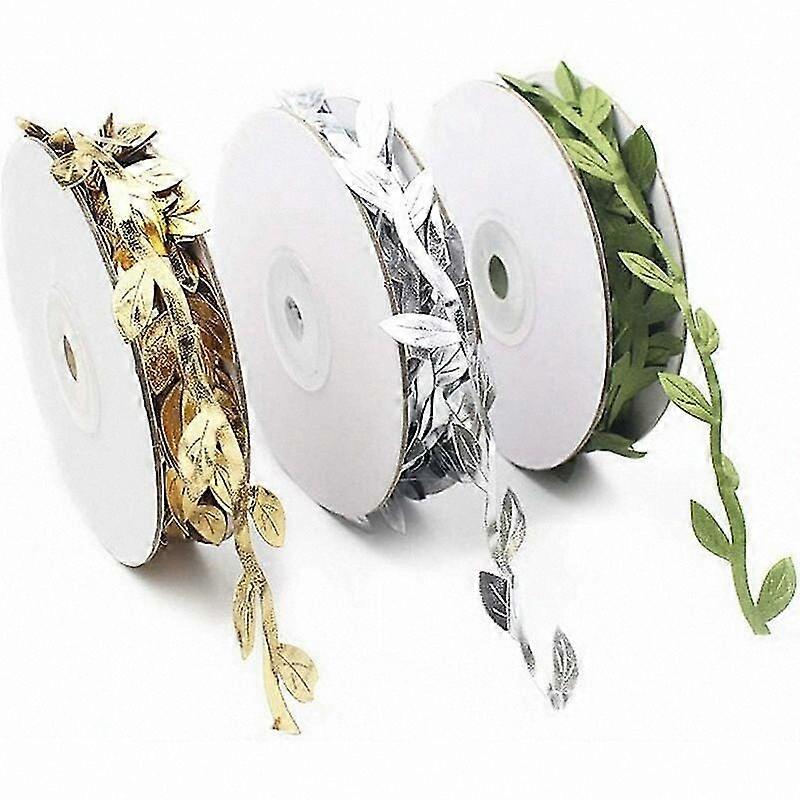 3 Rolls of Silk Leaf Ribbon with Artificial Vines and Faux Foliage for Wedding Decor, Gold/Silver Simulation Rattan Leaves for Events and Crafts