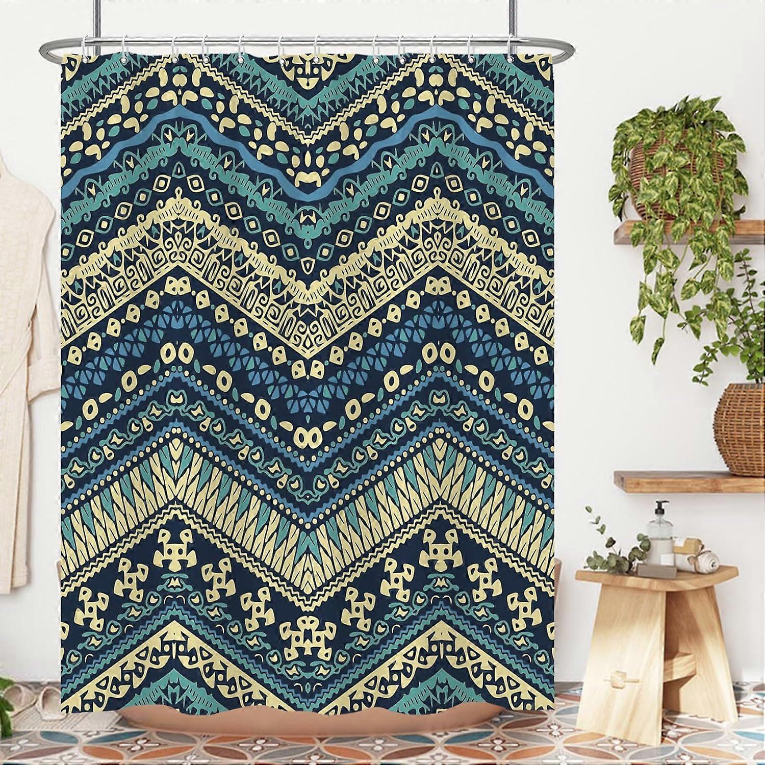 Green Bohemian Shower Curtain,Green Yellow Boho Shower Curtain Set for Bathroom,Colorful Stripe Modern Fabric Bath Curtain with Hooks, 60x72inches