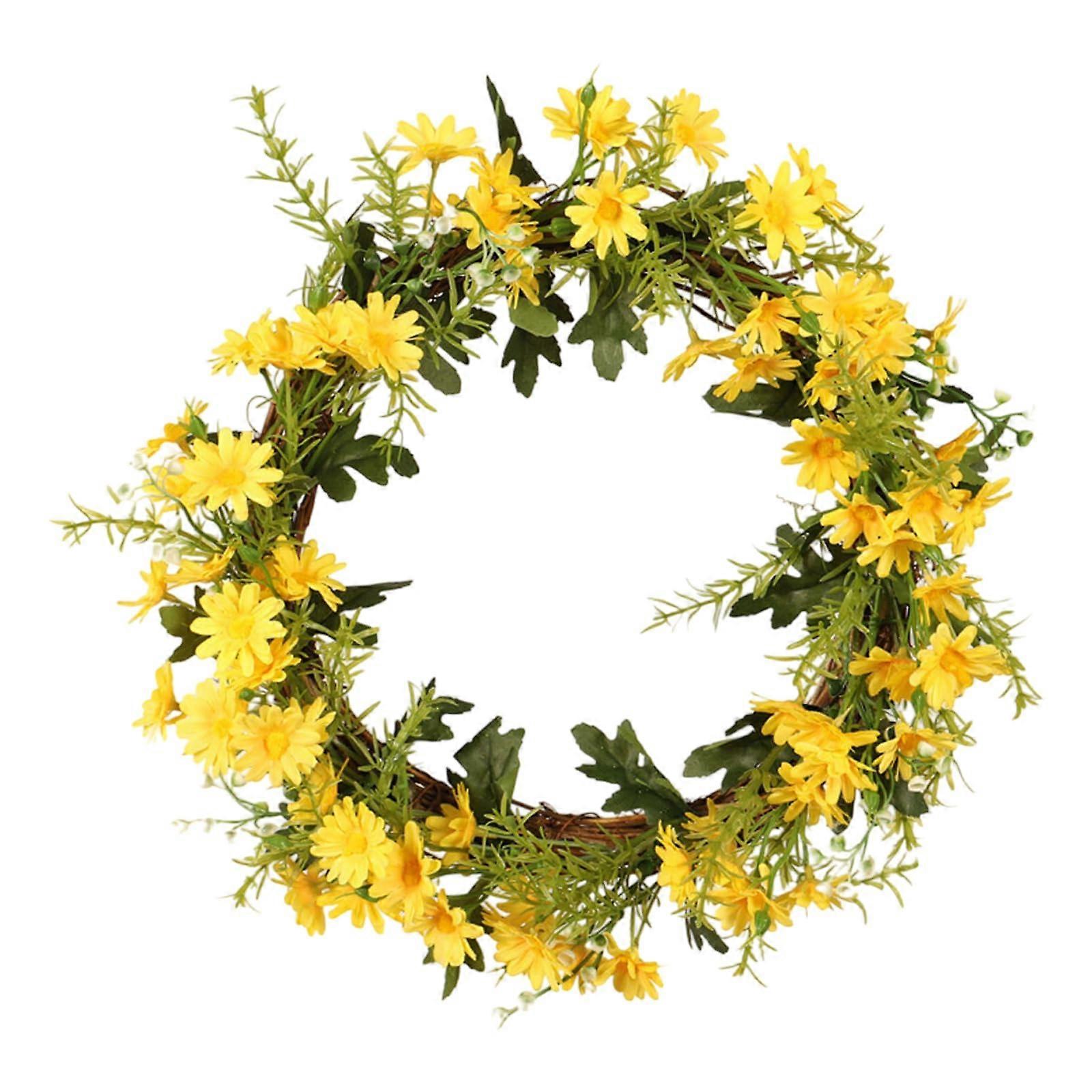 Artificial spring wreath with green leaves, daisies, floral wreath for front door, wall, wedding, party, home, 35.1 cm