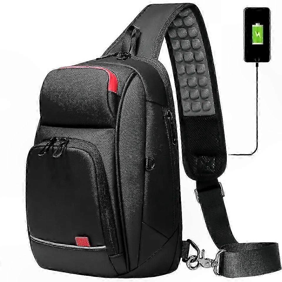 【HIGH-QUALITY MATERIALS, STRONG AND STABLE】The men's backpack is made of high-density, waterproof and tear-resistant PVC material and lined with polyester fabric. The metal zipper with two-way opening is designed for durability. The buckle and hanging loop of the chest backpack are made of stainless steel and will never rust. 【LARGE CAPACITY】7*4*11 inches (L*W*H). This shoulder bag is spacious enough to store various items such as iPad, tablet, wallet, mobile phone, keys, books, credit cards, laptop or other everyday items. 【MULTI COMPARTMENT SHOULDER BAG】The crossbody bag has multiple compartments, two small zipped pockets and one large zipped compartment on the front, two open pockets on one side, one small zipped pocket on the other side, one mesh pocket on the side, one glasses holder and one card holder on the shoulder strap to keep your belongings organized. 【WITH USB CHARGING PORT】The slanted men's backpack has an external USB port with an integrated charging cable that can be connected to a mobile power supply (mobile power supply not included) for charging, making charging easy and convenient. 【ADJUSTABLE SHOULDER STRAPS】Breathable, adjustable, wide shoulder straps made of breathable material reduce pressure on your shoulders. The waterproof backpack is equipped with an adjustable chest buckle that allows you to freely adjust the length of the straps. 【MESH BACK PADDING】The entire surface of this sling backpack is made of multi-layer, honeycomb-shaped, elastic mesh fabric for comfort and breathability. 【MULTIFUNCTIONAL SHOULDER BAG】This is a multifunctional bag that can be used as a shoulder bag, hiking backpack, travel bag, leisure backpack, messenger bag and business bag. 【GREAT GIFT】This backpack is the perfect companion for outdoor activities, suitable for camping, short trips, holidays, traveling and hiking. Ideal gift for husband, wife, lover, son, daughter, motorcyclist or daypack use. 【PRODUCT SPECIFICATION】 Type: Men's chest bag Color: Black Material: Oxford/PVC Inner lining: Polyester Function: USB port, breathable, waterproof Use: Business and leisure, office travel Capacity: iPad, mobile phone, wallet, etc. Size: Width 19.5 cm * Thickness 13.5 cm * Height 30 cm Weight: 650 g QUALITY MATERIAL: The backpack is made of PVC material lined with polyester fabric. The buckles and suspension loops are made of stainless steel for durability. LARGE CAPACITY: 7*4*11 inches. The multi-compartment design provides space for your iPad, wallet, mobile phone, keys and other everyday items. USB PORT: The men's backpack has an external USB port for connecting to a mobile charger (mobile charger not included). ADJUSTABLE SHOULDER STRAPS: Breathable, adjustable shoulder straps made of breathable material reduce pressure on the shoulders. MULTIFUNCTIONAL: Can be used as a shoulder bag, hiking backpack, travel bag, leisure backpack, messenger bag and business bag.