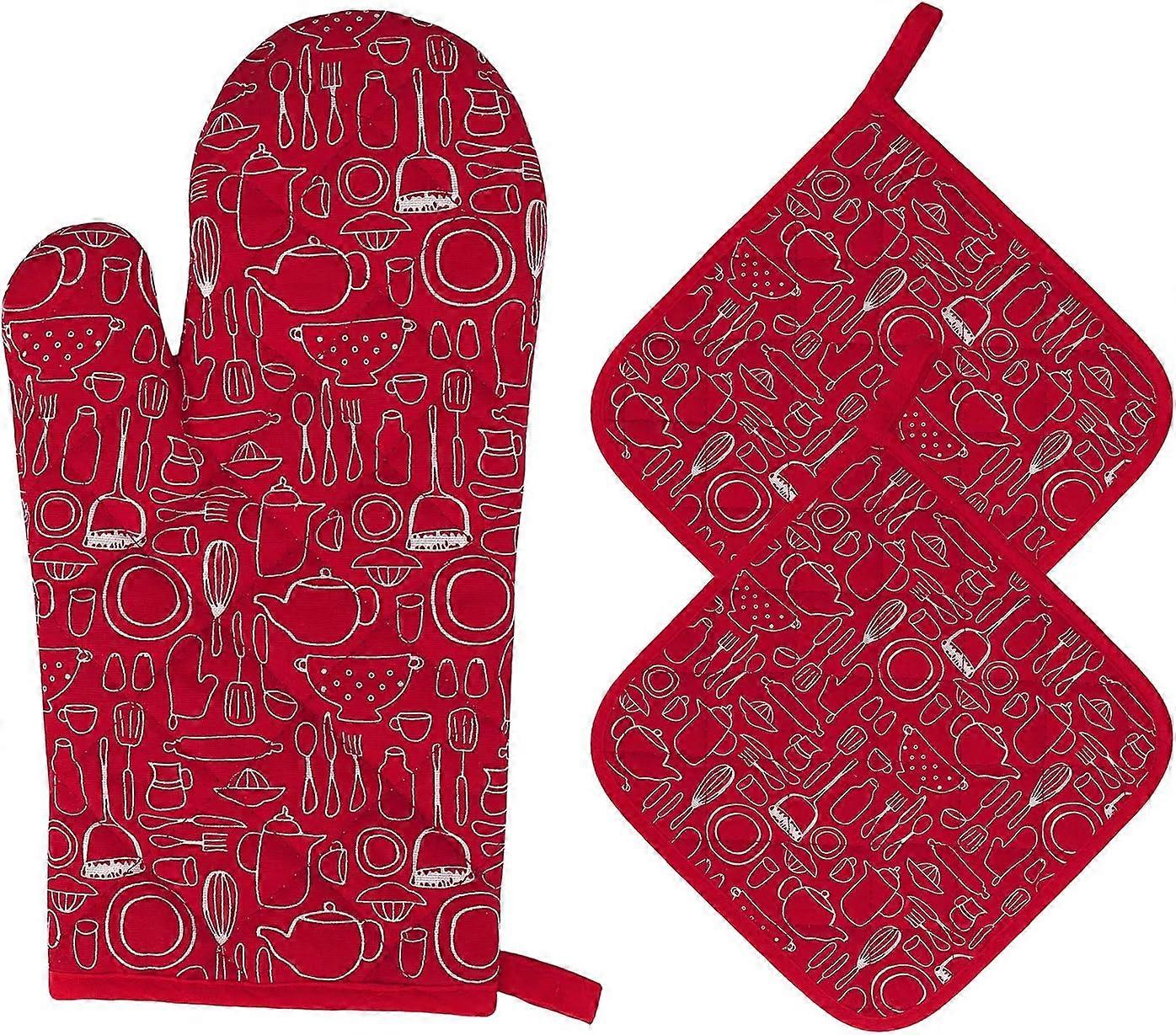 Heat Resistant Oven Gloves Set 1 Thick Cotton Oven Mitts with 2 Placemat Pot Holders Long Cuffs Baking Gloves for Kitchen, Cooking, Barbeque 3 Pieces