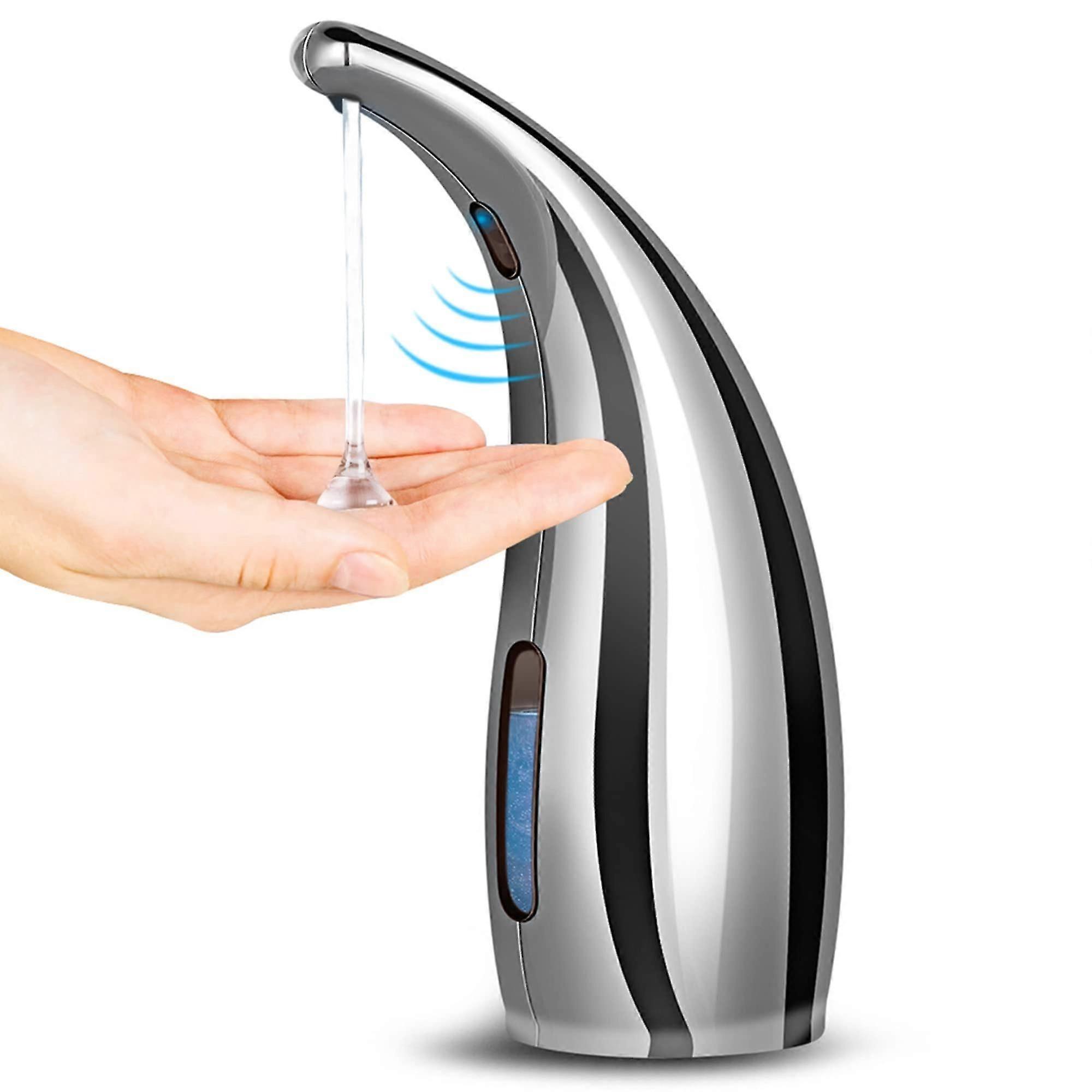 Easy and Convenient Design Auto Hand Soap Dispenser: Put your hands down and soap will come out automatically. Easy and funny to use even for a child or an old people. No Touch Soap Dispenser for Kitchen Sink: Build-in infrared smart sensor inside the electric countertop soap dispenser - no need to touch any buttons. Totally handsfree. Sensitivity Infrared Sensor Dish Soap Dispensers: Just need only 0.5 seconds induction time to pump the soap out. With Built-in Accurate Infrared Motion & PIR sensor detection technology, soap dispenser is so smart to avoid the second cross-infection. And motion Range of 0~2.36 inches. Don't need to wave your hands. Top Refillable and Large Capacity Kitchen Gadget : You can refill many times and it's a 300ML smart design. All are User-friendly and Humanized design. Technology makes life easy. Happy and Funny Hands Washing Up: Stay health with your kids, lovers, family members and friends. Enjoy this little and smart pump with nice mood each day. Warmly Reminder 1. 4 * AAA batteries needed. Check "+" and "-" carefully before installing. (Battery is not included in the scope of supply) 2. 1st time use, please poke the black noozle by your hand 3~4 times so airflow is unblocked. 3. If blue light is on but not soap dispensed, please change brand new batteries. Caution: Material is plastic. Color is chromed color.
