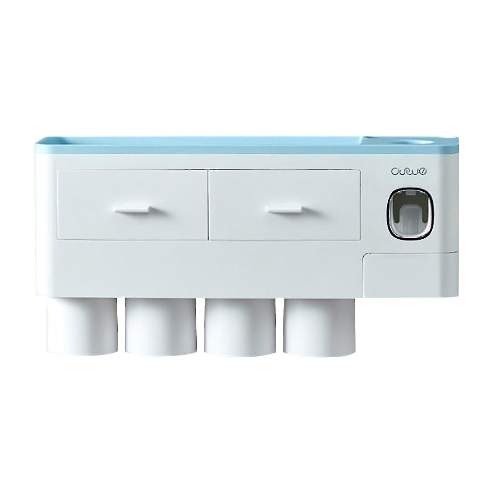 AUTOMATIC TOOTHPASTE DISPENSER - This Toothbrush Holder features a built-in automatic toothpaste dispenser. It automatically assigns the perfect amount of toothpaste for you every time and prevents any waste of toothpaste. INVERTED MAGNETIC CUPS - The upside-down cups are reinforced with a strong magnetic feature that securely attaches the cup to the holder. It allows the cup to quickly drain off water, preventing reproduction and keeping the cups dry, clean and hygienic. LARGE COUNTER-TOP SHELF & DRAWER COMPARTMENTS- The Toothbrush Holder comes with a large counter-top shelf for you to neatly organize your grooming tools, bathroom essentials or other self-care products. There are also 2 drawer compartments provided to store cosmetics and other smaller accessories for easy access. ZERO WALL DAMAGE INSTALLATION- The toothbrush holder is attached with specifically designed strong wall mount stickers that don't leave any traces on the wall. It can bear up to 6 kgs of weight and still won't fall off. HIGH QUALITY & ENVIRONMENTAL MATERIALS- The Toothbrush holder is made of non- toxic, odorless ABS materials. You can feel its silky surface, beautiful and exquisite design right away.