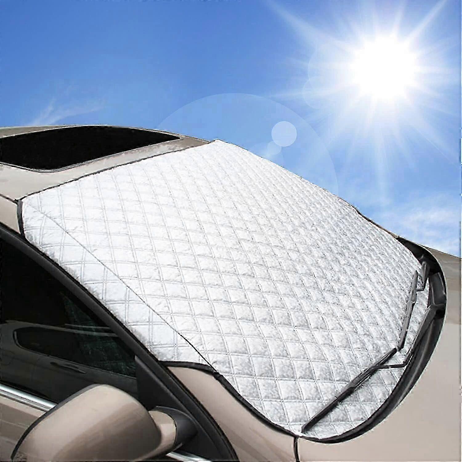 Heavy Duty Windshield Cover for Cars SUVs All Years Snow Ice Frost Dust Resistant HEAVY DUTY & FOUR LAYERS: The car windshield cover is made of 4 layers - PEVA Aluminum Foil, Spunlaced Cotton, Composite Cotton, Soft Non-Woven Lining. Ultra thick and heavy duty to keep the windshield clean & clear, help blocking the car wiper area from filling with leaves and pine needles.<br> SUMMER & WINTER PROTECTION: Summer - Blocking out nearly 99% of UV rays , help to turn down the temperature during hot & sunny weather. Winter - -50C low temperature resistance. It can prevents frost/snow/ice build up on the windshield in the winter and reduces the time spent scrapping ice or snow in the mornings.<br> 2 SIZES FOR MOST CARS: The X-large size (145x100cm) fits for SUVs Vans Trucks Minivans. (Please measure your vehicle prior to purchase to ensure your cover fits)<br> EASY TO INSTALL: Easy & convenient to use, No tool required for installation. Secure with side flaps design, prevent from falling off. (SILVER SIDE UPWARDS)<br> MULTI-FUNCTIONAL: It is not only a windshield cover - It can be used as camping table mat, tent sleeping pad,pets sitting car mat in your car and crawling mat at the outdoors.