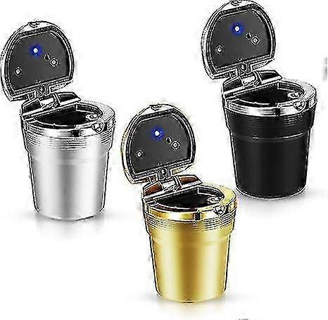 3 Pieces Car Ashtray with Lid Smell Proof Portable Ashtray Automotive Ashtrays GOLD SILVER BLACK Attractive shape: these car ashtrays come in a variety of colors, including black, gold and silver, vivid and stylish, they can catch people's attention quickly; And they have LED lights on the lids, which make them easier to find in the dark; The attractive appearance can make the car ashtrays stand out from your itemsThoughtful design: each portable car ashtray with lid has LED light on the lid, just need to take the lid off, then it lights up, the soft blue light can provide with huge convenience; Besides, it has a clamshell design that helps insulate air and reduce strong odors, can use it with confidenceFine workmanship: the car ashtray sets are mainly made of stainless steel and plastic; Its outer shell is made of stainless steel, which is hard and solid, smooth and quality, easy to deform and break; Its interior is made of plastic, which is reliable to use, having a long service time, can use it for a long timeAssorted places to use: these car ashtrays with lids can be applied in many places, such as living room, bedroom, dining table, car, hotel, office and so on; They can also be served as decorations in your daily life, they can provide you with a beautiful and cool decoration effectSufficient to meet your needs: there are 3 pieces of ashtrays for cars in the package in total, they come in 3 different colors, which are classic and bright; Sufficient quantity can meet your daily uses and replace needs, you can also share them with your friends and family, they be happy to receive these practical gifts