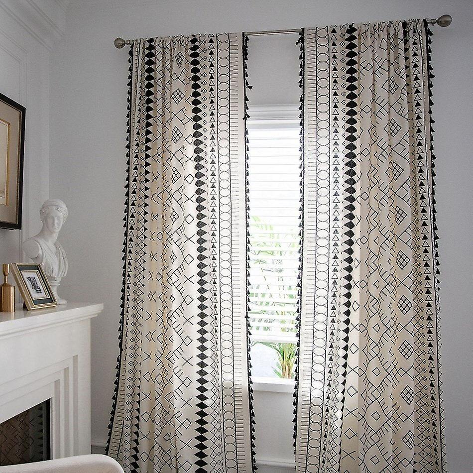 Boho Cotton Linen Curtain American Tassel Finished Black And White Printed Curtins For Living Room Bedroom Kitchen Home Textile