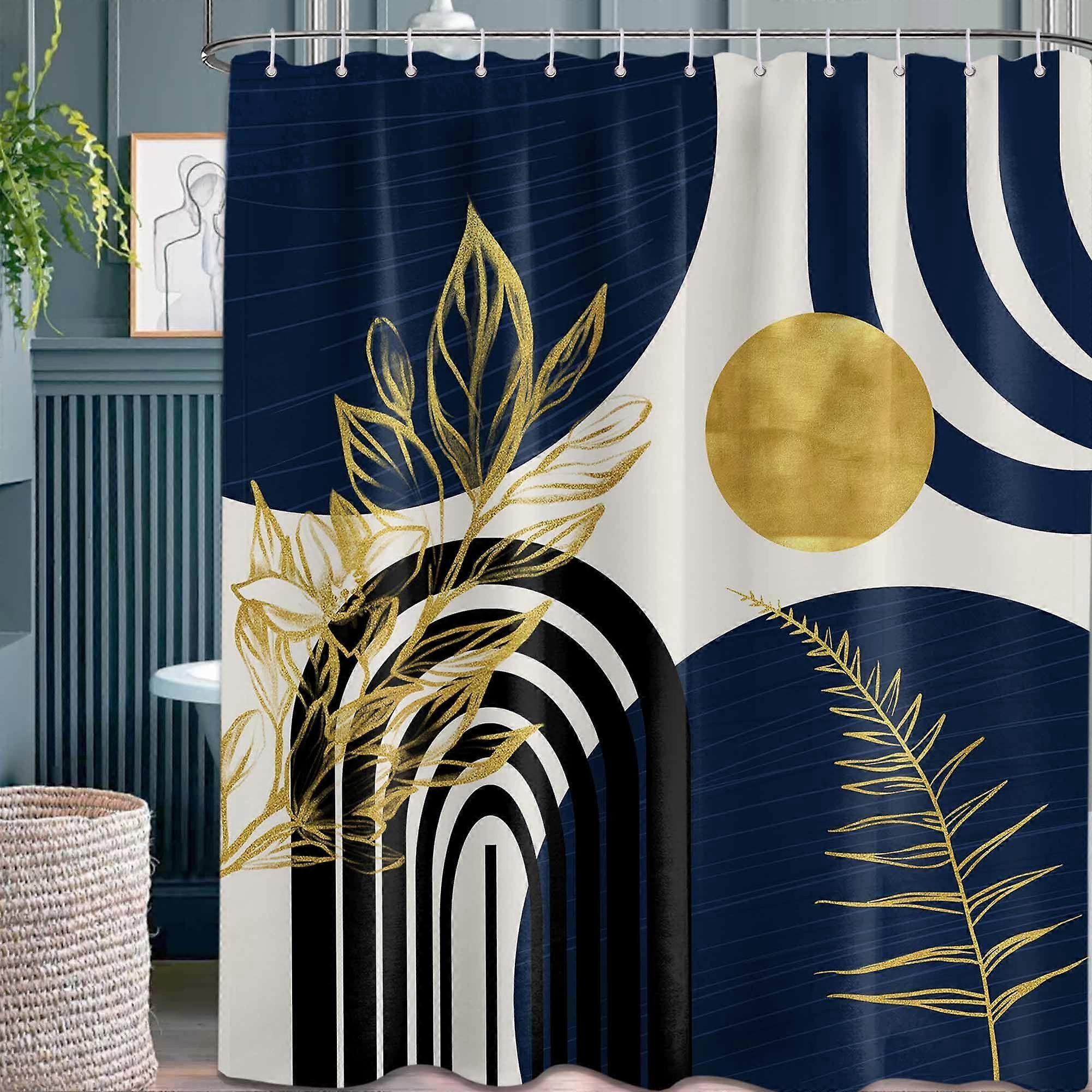 Boho Mid Century Modern Shower Curtain Navy Blue Bohemian Dark Blue Gold and Leaves for Mens Bathroom Decor 70' W x 78' L