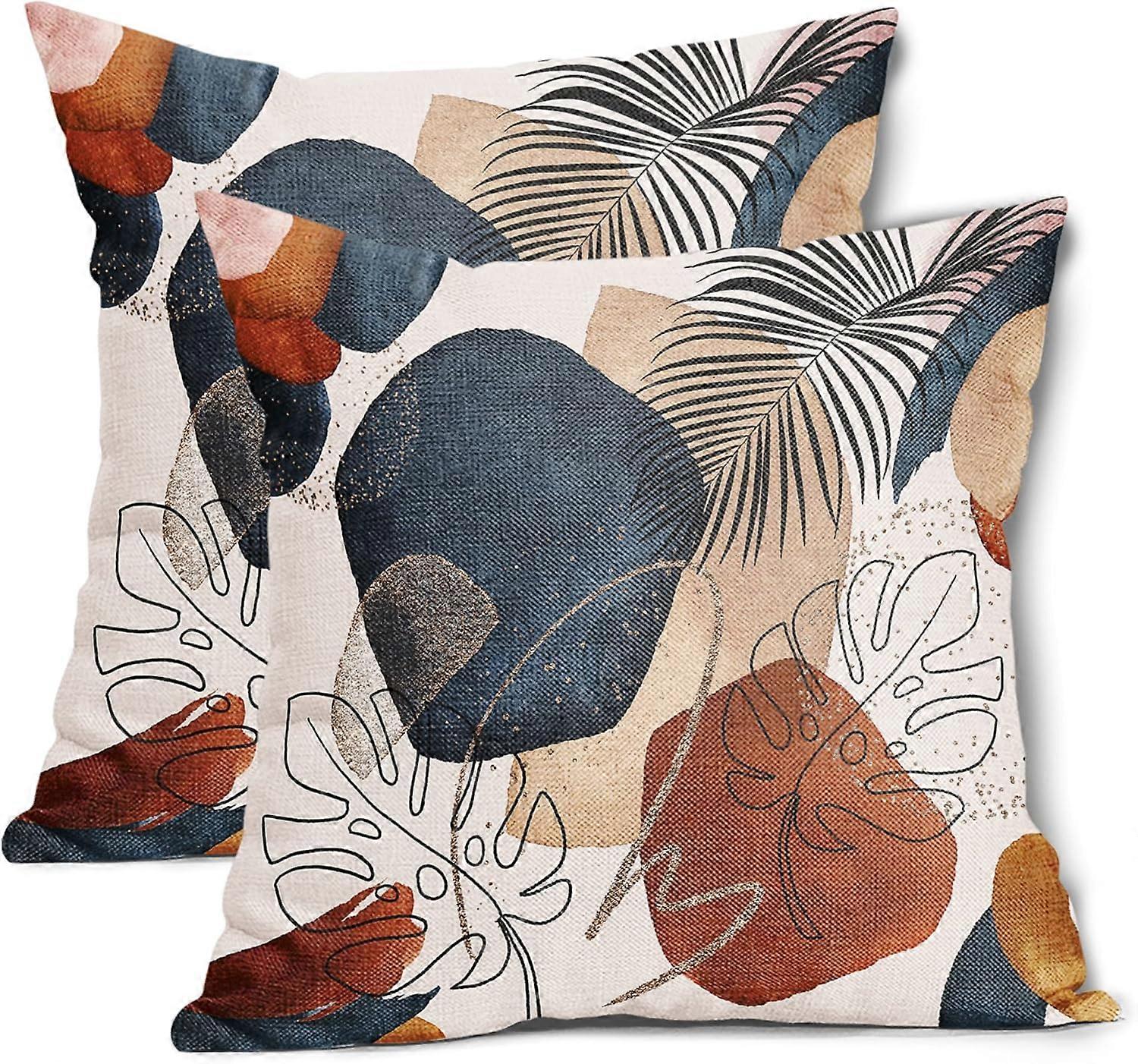 Boho Abstract Mid Century Pillow Covers 18X18 In Set of 2 Bohemian Minimalist Geometric Leaves Throw Pillow Cases Navy Blue Orange Gold Modern Pillow
