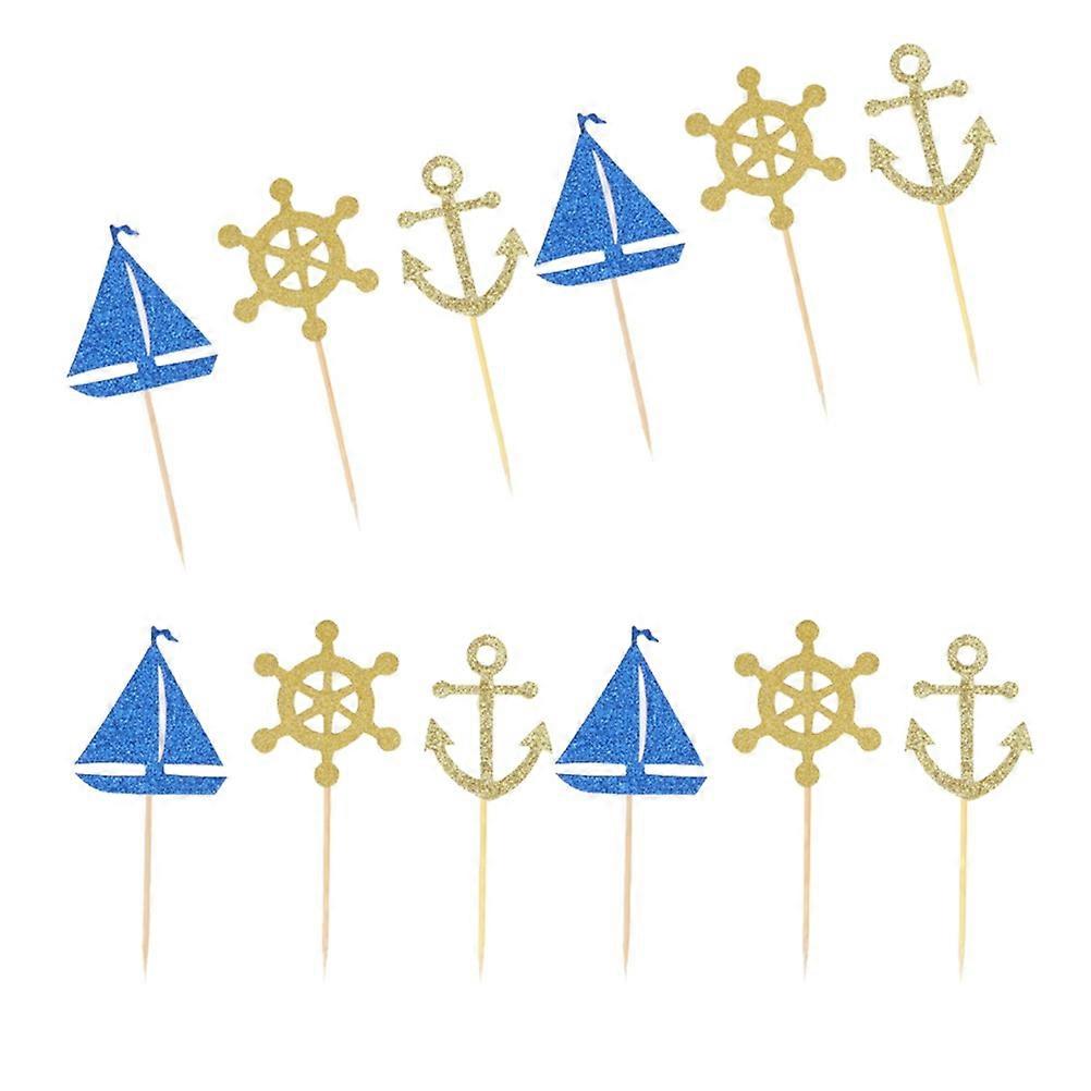 Nautical Theme Party Sailing Boat Anchor Cake Decoration Paper Gold Lame Material 12.5x5cm Appetizer Picks 36Pcs