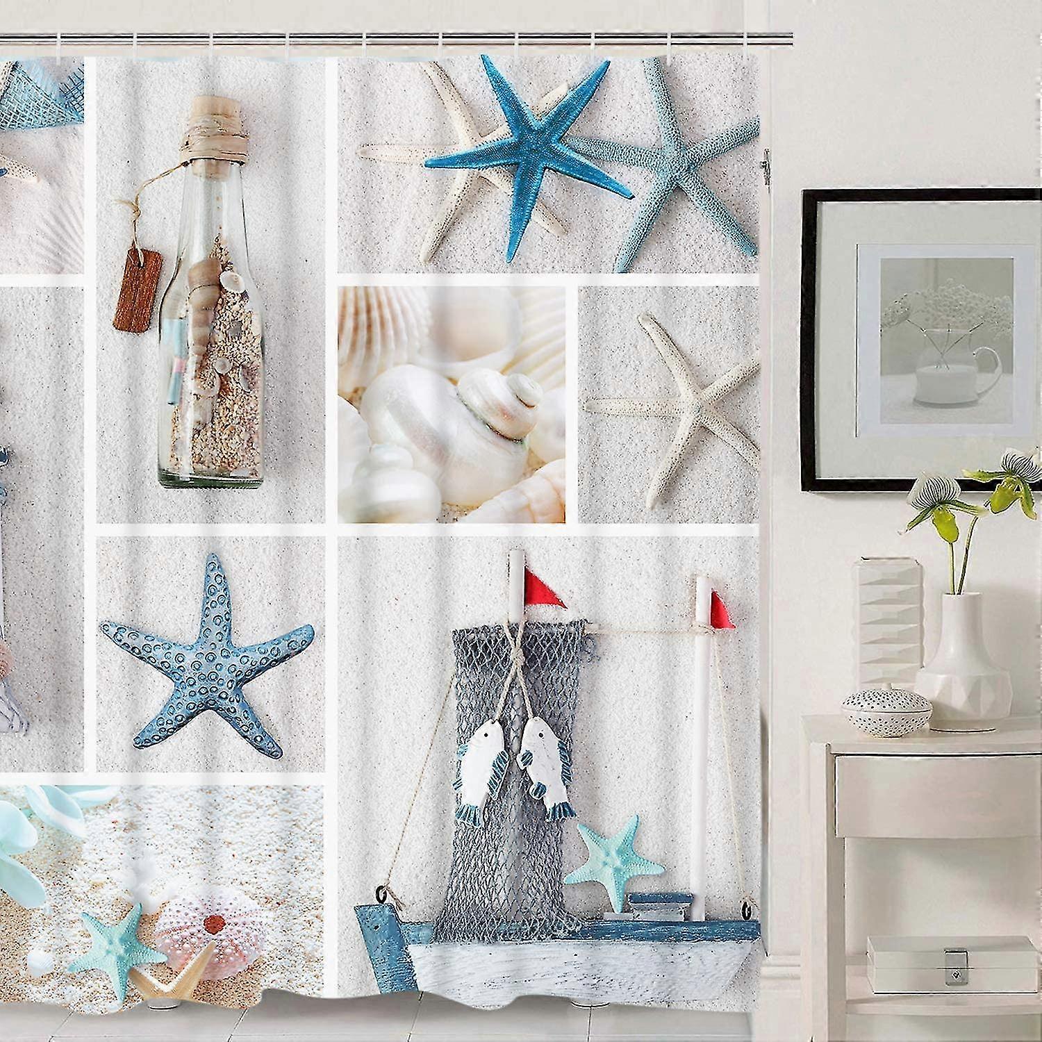 nautical shower curtain, marine sail boat beach starfish shell sea life shower curtain with 12 hooks, waterproof shower curtain (white blue #1, 72" l