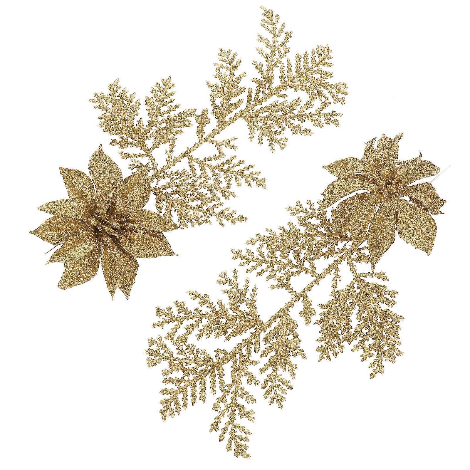 Flower Glitter Decorative Hanging Ornaments Faux Pine Stems Table Setting Decorations Golden 6Pcs