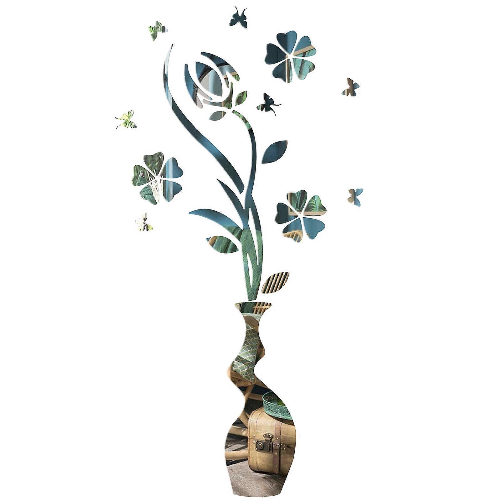 Floral Mirror Decals 3D Acrylic Wall Sticker Flower and Vase Silver for Bedroom Living Room Bathroom 1Pack