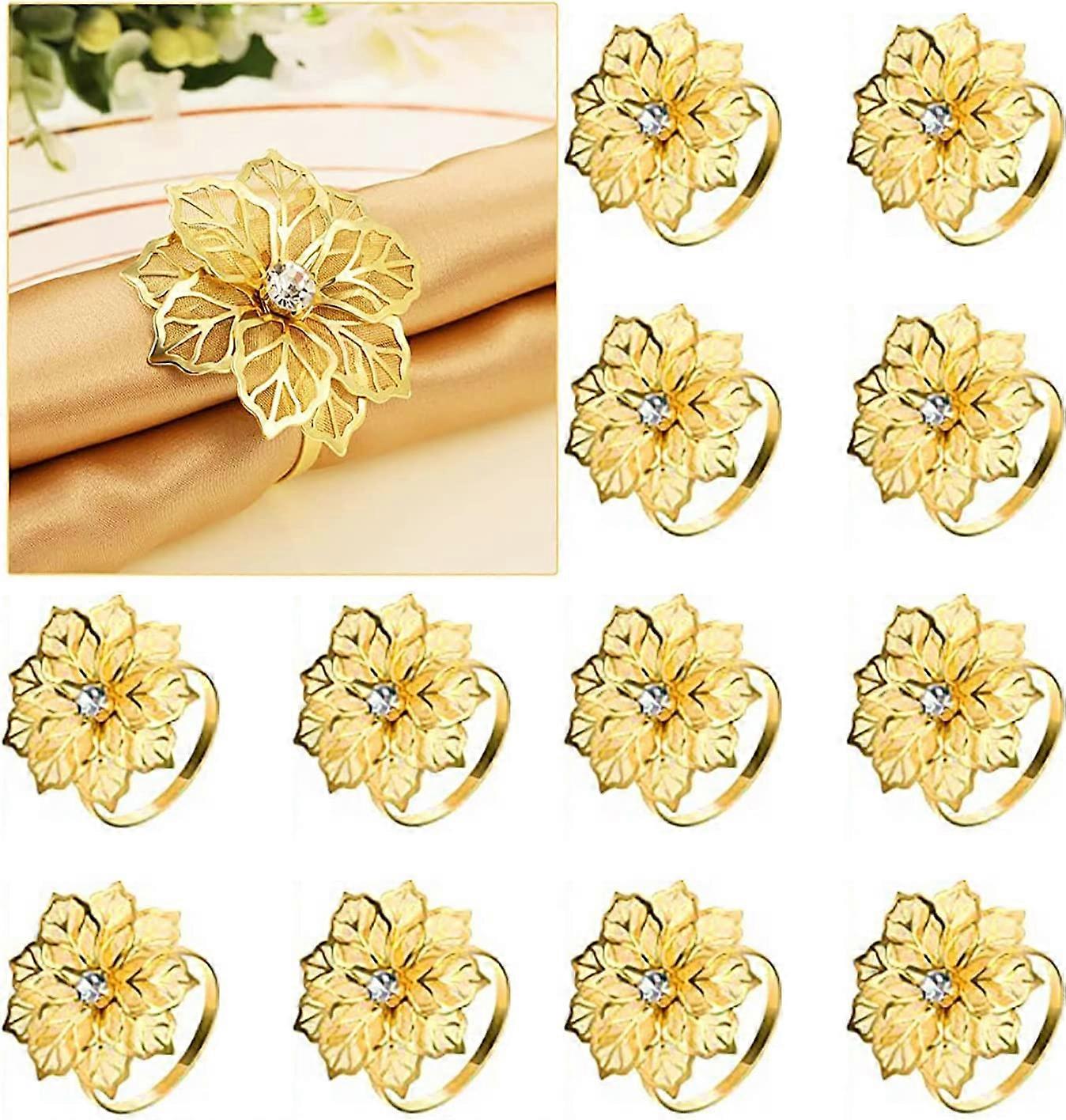 Flower Napkin Ring Buckle, Hollow Out Floral Rhinestone Metal Napkin Rings Holder for Wedding Banquet Christmas Dinner Table Dcor(Gold12pcs)
