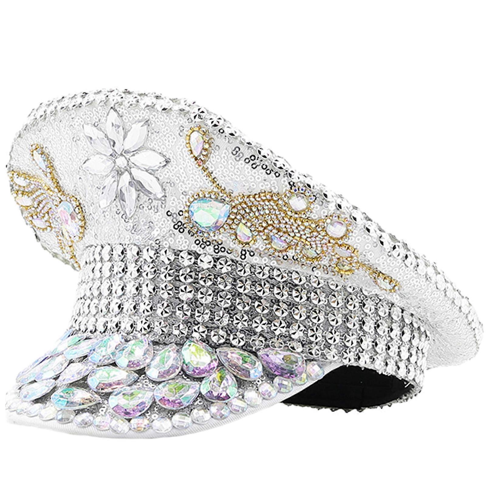 Rhinestone Studded Hat for Bride Cosplay Costume Party Cap Blingbling Sequins Hat Stage Performances Props MilitaryHat Silver