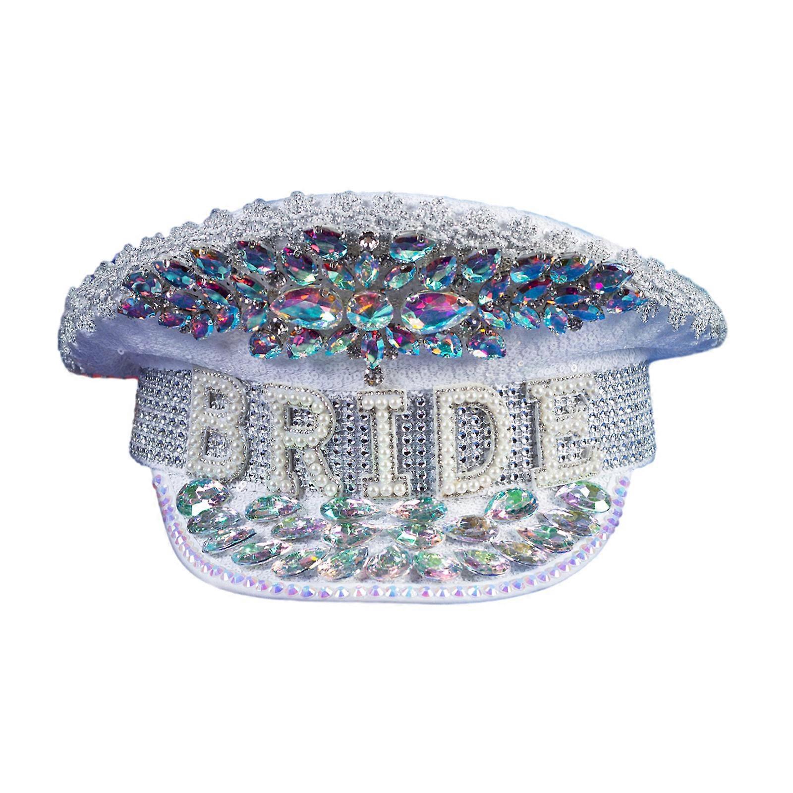 Bride Hat Pearls Captain Hat Encrusted Rhinestones Delicate BRIDE Banner Diamond-studded Hand Beading Hat White