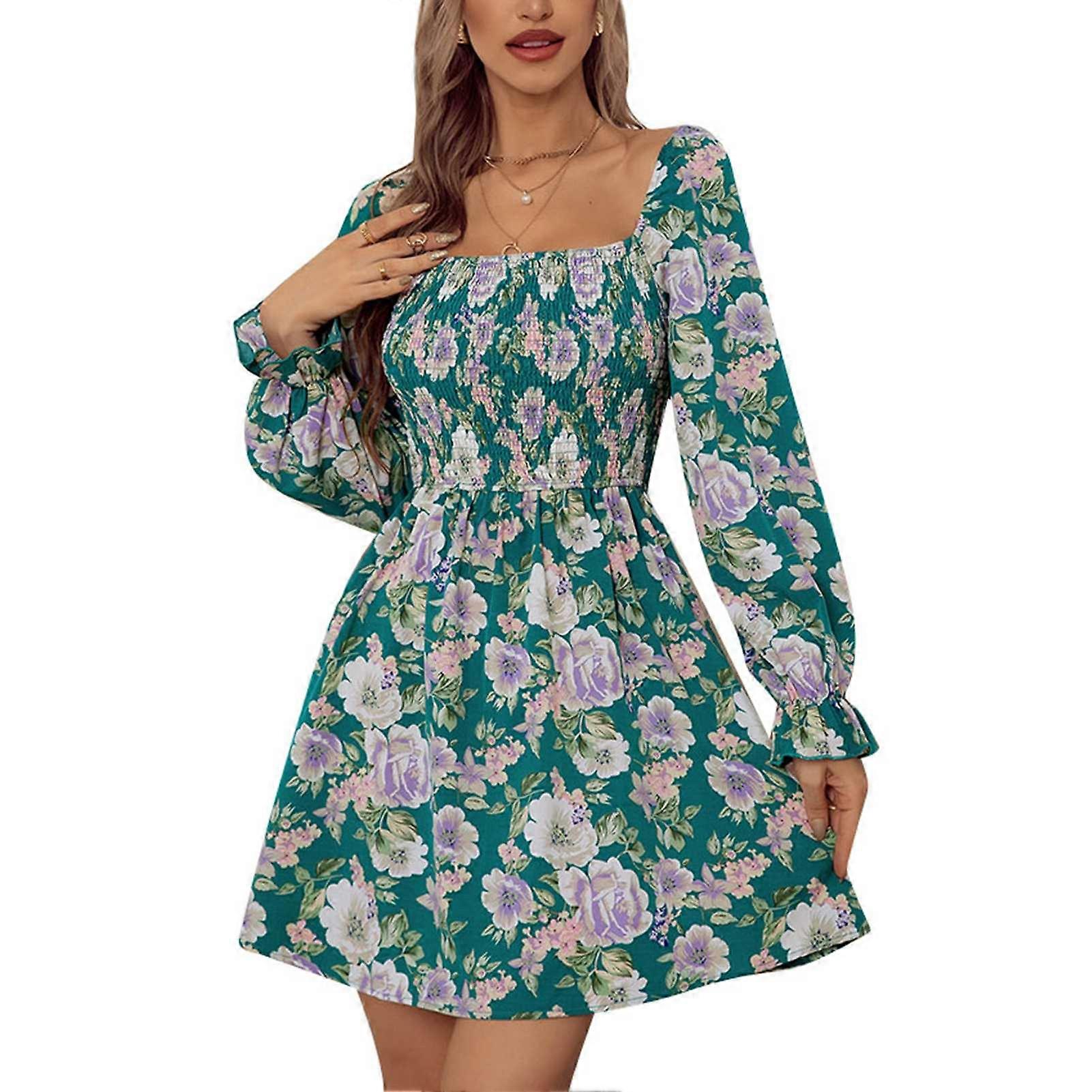 Floral Shirred Off Shoulder Dress Fashionable Elastic Stretchy Elegant Dress for Women Green M