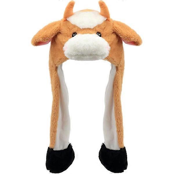 Brown Cow Hat with Ears Moving Jumping Pop Up Beating Plush Farm Animal Holiday Cosplay Dress Up Funny Festival Birthday Gift