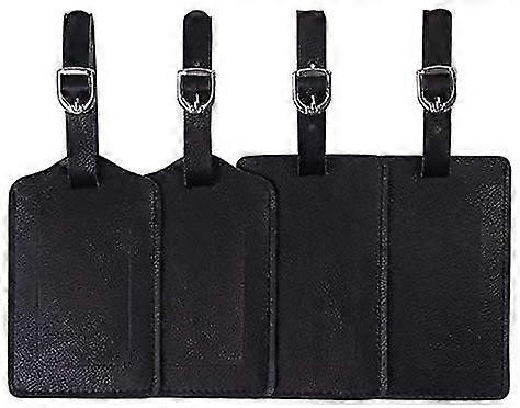 Soft microfiber leather luggage tags and adjustable leather belt,stainless steel buckle,with waterproof ID cover,natural quality than PU leather.Easy to hang on with buckle ,prevent your luggage against loss.;EASY TO IDENTIFYThe black luggage tags add fashionable and easy identify luggage when on a conveyor belt or at any point during travel.Use this stylish design,you dont afraid others take your luggage by mistakes.;CONFIDENTIALThe leather luggage tags with Full Privacy back cover protect your personal information in case your information being read by others ,as the flap will cover .This luggage labels come with a cardboard Size as a bank card,you have roomy space to write your personal information.WATERPROOFOpen the flap cover, PVC above the cardboard surface prevent card moist.Even in the rainy day ,the word on the name tag hardly get wet .USAGE BROADLY: The name tags can be use for suitcase, luggage ,handbags,briefcase,kids cars, gym bag, backpack,travel bags and so on.Nice choice for Valentine's gifts.Good ideal when travel by coach, plane, train, or ship. Packing:4 pack black luggage tags.Tag length :11.3cm x7cm(no include strap), Adjustable buckle hole strap length:from 8cm -9.5cmSafetyAdd a flap to prevent your info being read.Once signed,it will follow your luggage to whatever you go .SoftYou can feel ,touch and roll them ,it still keep its shape never change.DurableDont worry the luggage strap will loose on the journey ,it will fix tight to closure, not easy to tear apart and hardly lose.