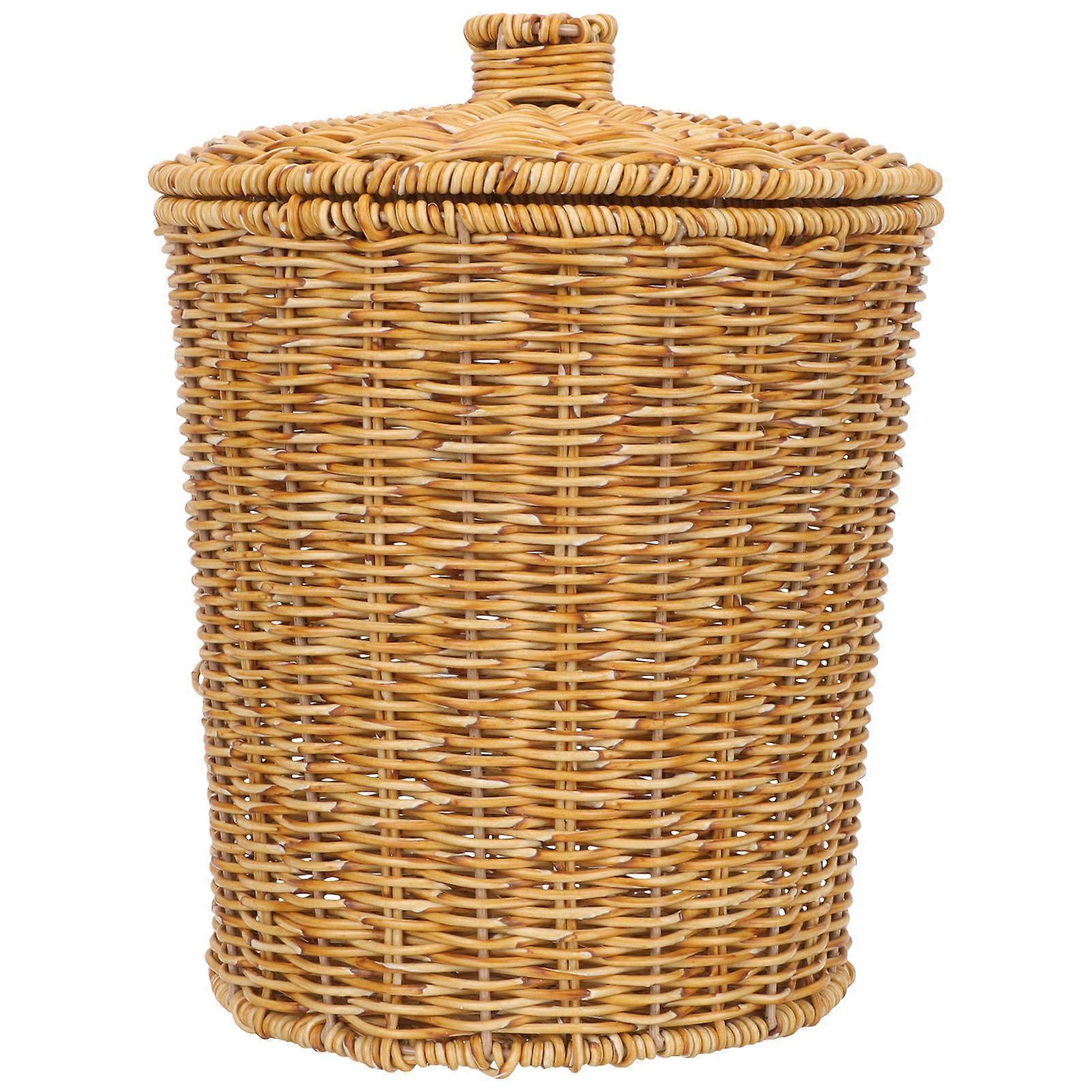 Imitation Rattan Storage Basket with Lid – Lightweight Woven Waste Bin for Bedroom, Bathroom or Living Room Use – Compact Decorative Design