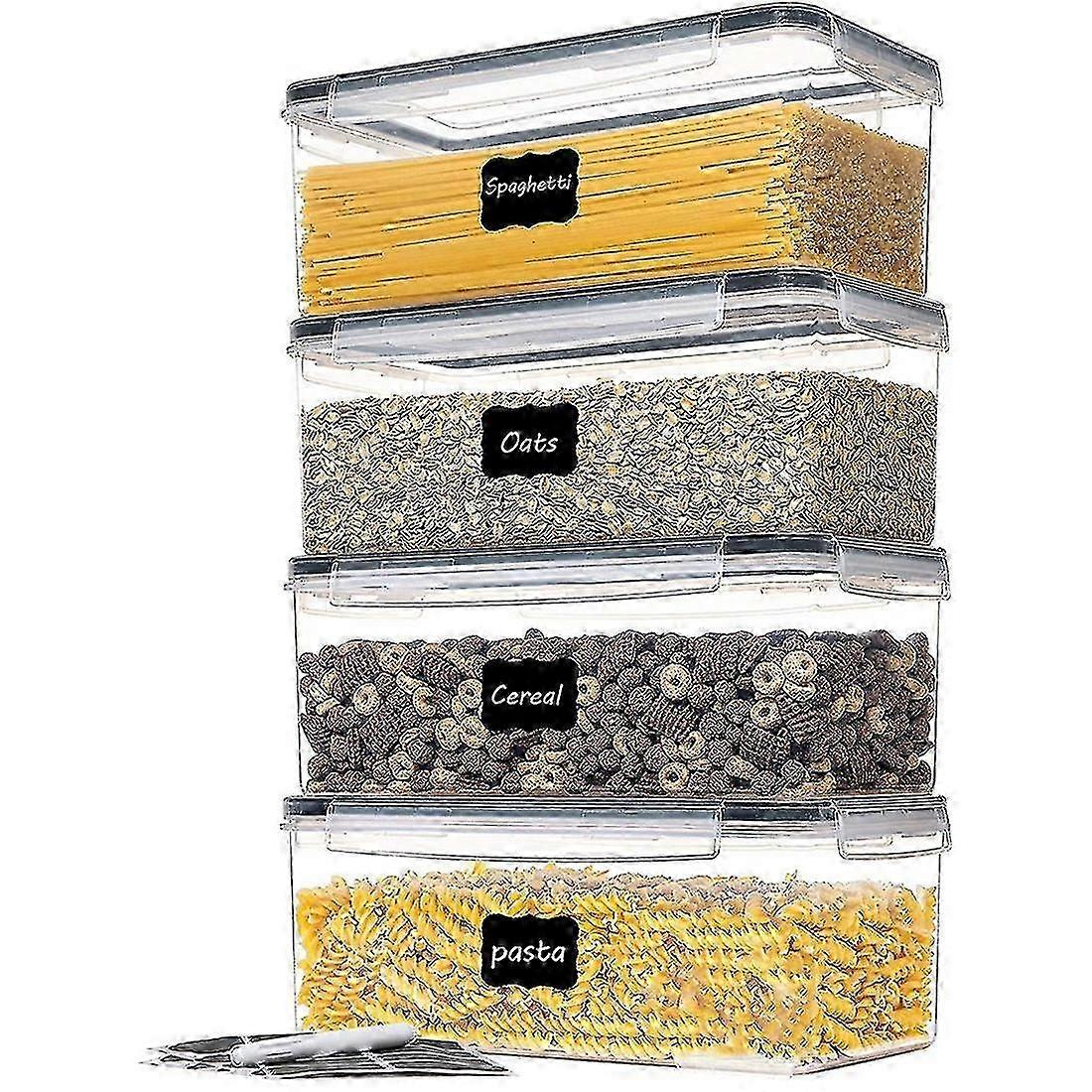 [Horizontal Storage] - Our pasta storage containers can lay horizontally from front to back of the cabinet instead of standing upright, which avoids things lost at the back of the shelf and keep every item close to the front. Perfect for not large but deep cabinets. So clever to have your long pasta lay flat, so you can just reach right in and grab a handful and can end up seeing them breaking into tiny spaghetti pieces [Suitable Storage Size] - The set comes with 4 same size kitchen storage containers, 3.2L for each. Large enough for 8lbs spaghetti. Also perfect for pasta, fettuccine, lasagna noodles, angel hair, linguini, fusilli, farfalle, garganelli, macaroni, cereals, snacks and other dry food [Secure Sealing Freshness] - The side-locking lids are thick yet easy to snap on and off. The rubber gasket of our pasta containers keeps out air and moisture, so your foods in it may taste just like the day you open after a few months [Durable] - pantry containers are made of shatterproof PP, free, which have a longer life than many other plastic containers Material:PP colour:Transparent + Black Package Contents: 4 * airtight jars 24 * labels 1 * pen Only the above package content, other products are not included. Note: Light and different displays may cause the color of the item in the picture a little different from the real thing. The measurement allowed error is +/- 1-3cm.