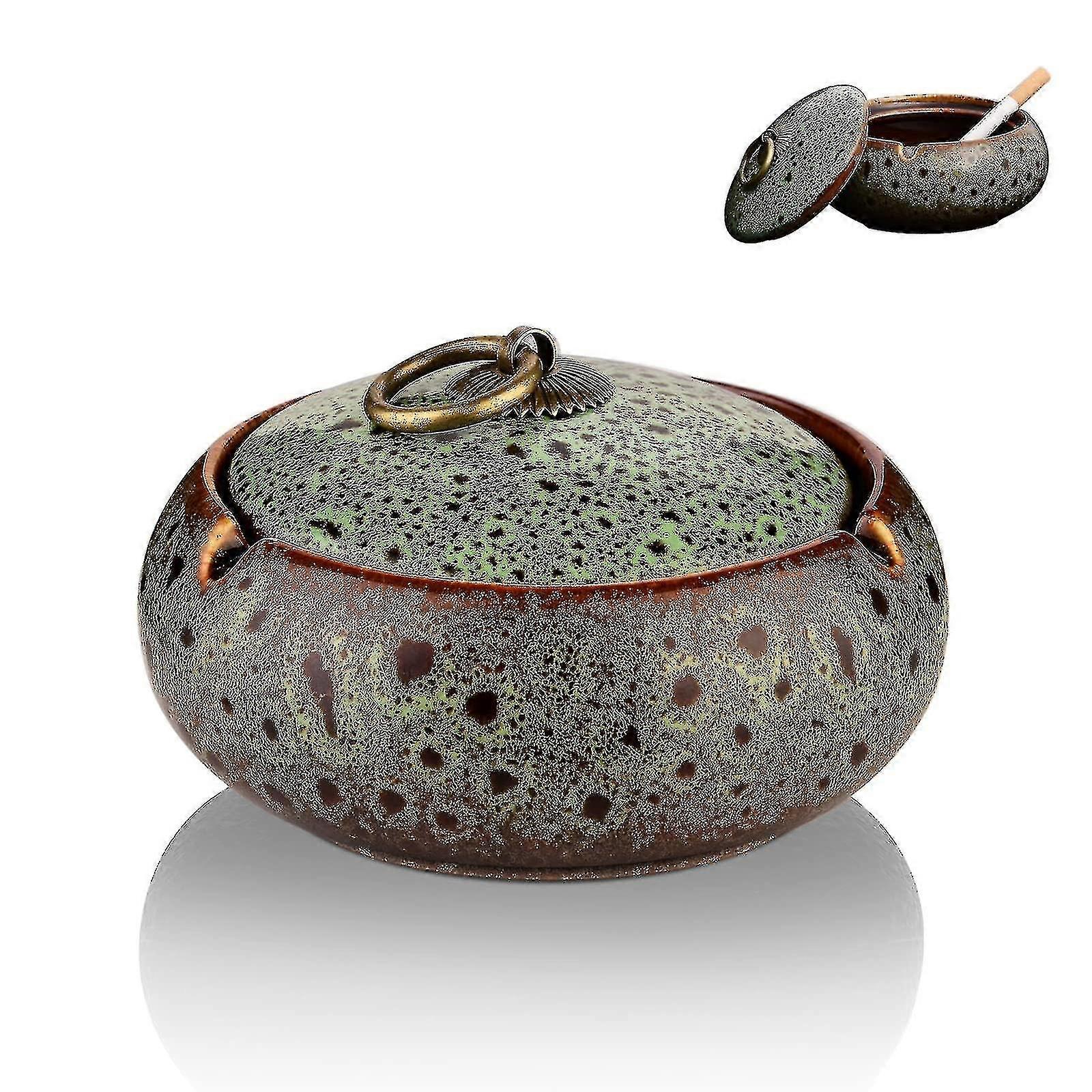 Perfect Size And CraftsmanshipIn the interior of 8 x 11cm, which can accommodate a sufficient number of cigarette butts and cigarette ash. Elegant shapes and lively colors look very modern and stylish and fit perfectly into each Indoor or outdoor decoration and can be used as a beautiful table decoration.High QualityThe decorative ashtray is made of glaze ceramic that is rust-free and anti-corrosion with high quality. Durable and easy to clean, washing does not change color and does not fade It not only looks like an ashtray, but also a piece of pretty pottery as a decoration on the side table.Windproof Ashtray CoverThe ashtray with lid can close its smell for non-smokers, and you dont need to worry about the rainy day any more, the lid will keep the rain out and the ashes from blowing everywhere, which also can well hide unsightly butts and keep the smell out of the air. Provide the most pleasurable smoking experience for you and your guests.Non-Slip BottomThe non-slip bottom design of our big ashtray will safeguard your tabletop from any scratches and protect it from winds; Each outside ashtrays for men and women features three cigar holders and a deep basin to share with friends, family, clients or coworkers while keeping your table completely clean.Suitable for bedrooms, living rooms, balconies, outside, bar, terrace, company, cafe, hotel.