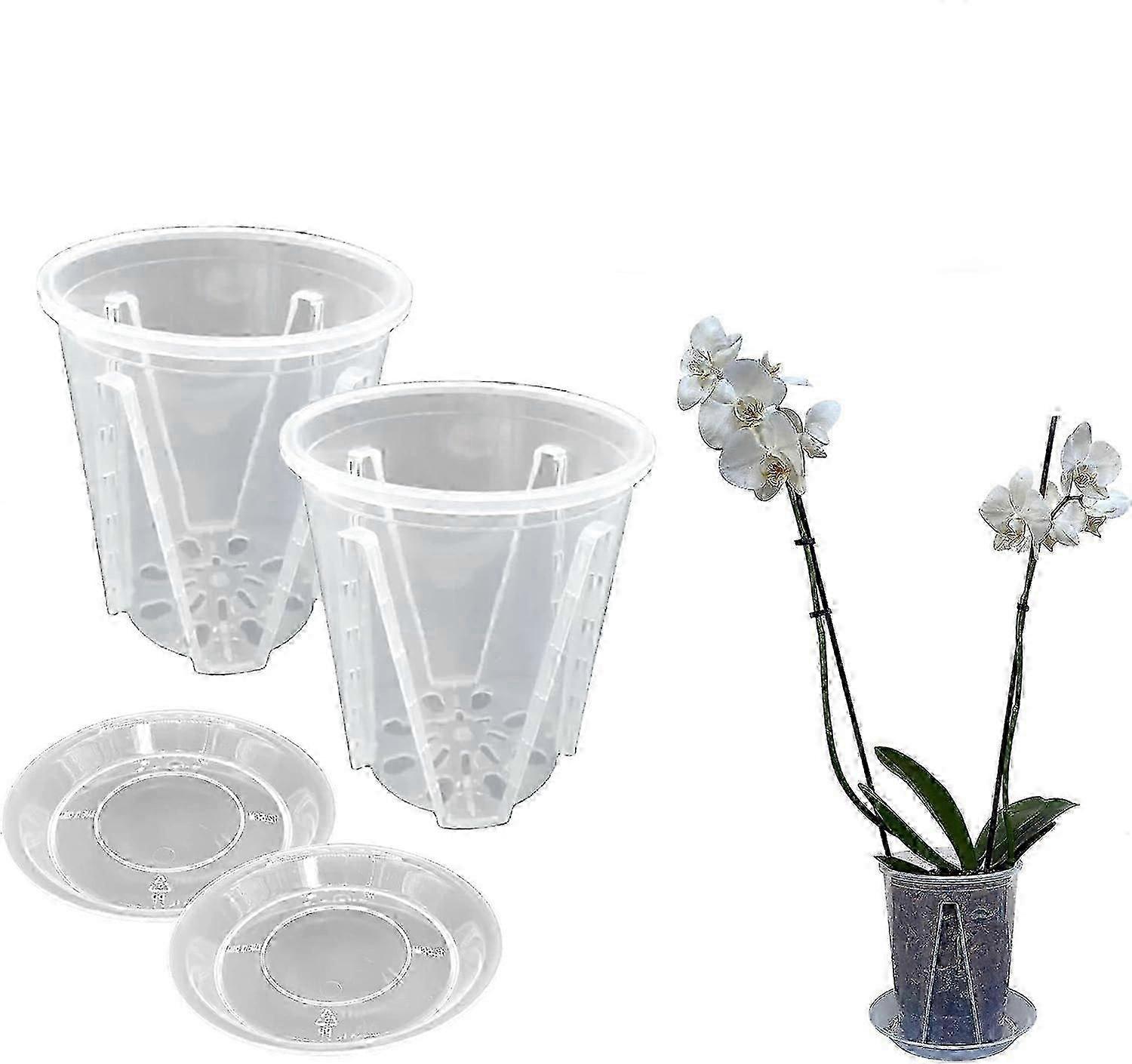 Set of 2 Pots Diameter 14 cm in Transparent Plastic for Orchids, Rigid Vases with Drainage Holes and Saucer, Accessory for Growing Plants and Flowers
