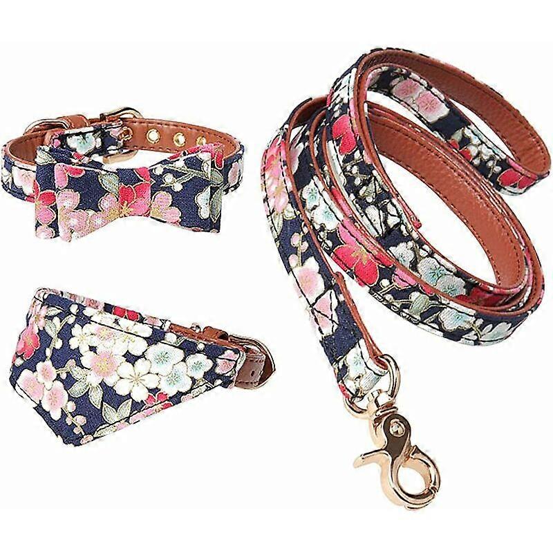 Dog Collar Set with Bow Tie and Adjustable Leather Pet Leash - Floral Pattern
