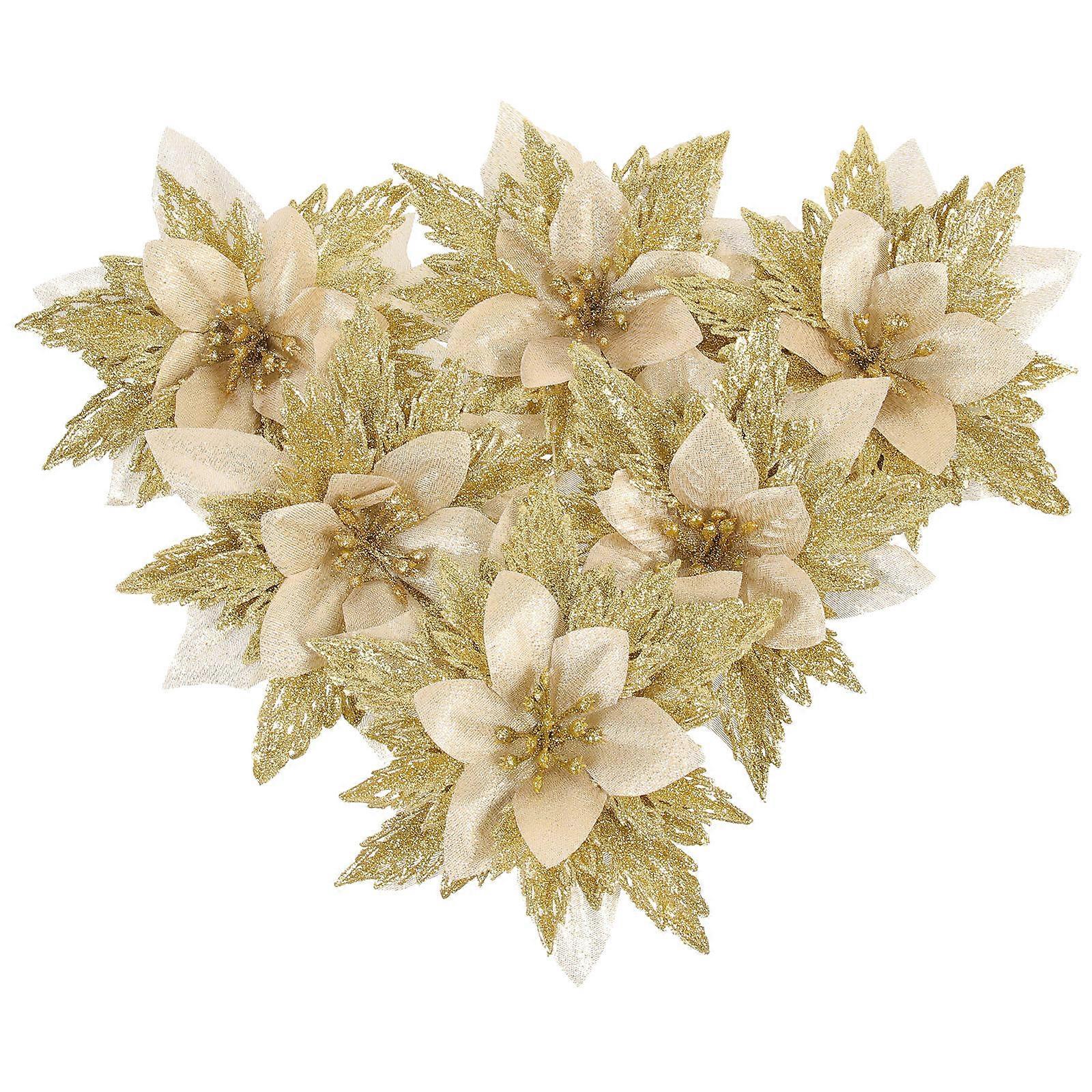 Golden Plastic Christmas Simulation Flower for Decoration 6pcs Glitter Floral Xmas Tree Ornament 0.5 Inch