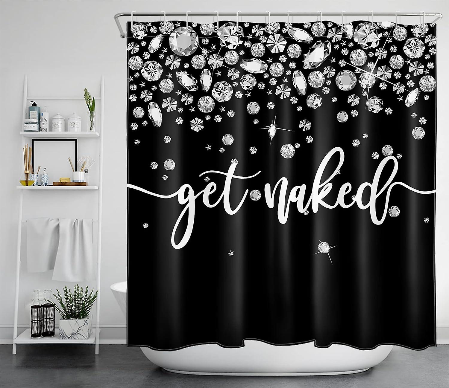 Get Naked Black and White Shower Curtain Bling Luxury Silver Jewelry Bath Curtain Funny Words Polyester Anti Mould Waterproof Bathroom ,71x71 inches