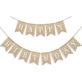 Happy Birthday Banner For Birthday Party Decorations, Rustic Burlap Bunting Chevron, 2 In 1, Linen White