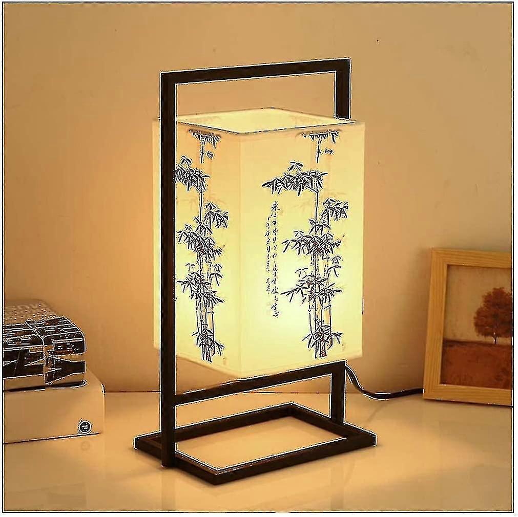 Dimmable Japanese Bedside Lamp with Black Metal Frame & Cuboid Fabric Shade, Modern Asian Table Lamp for Night Soft Lighting in Bamboo Color