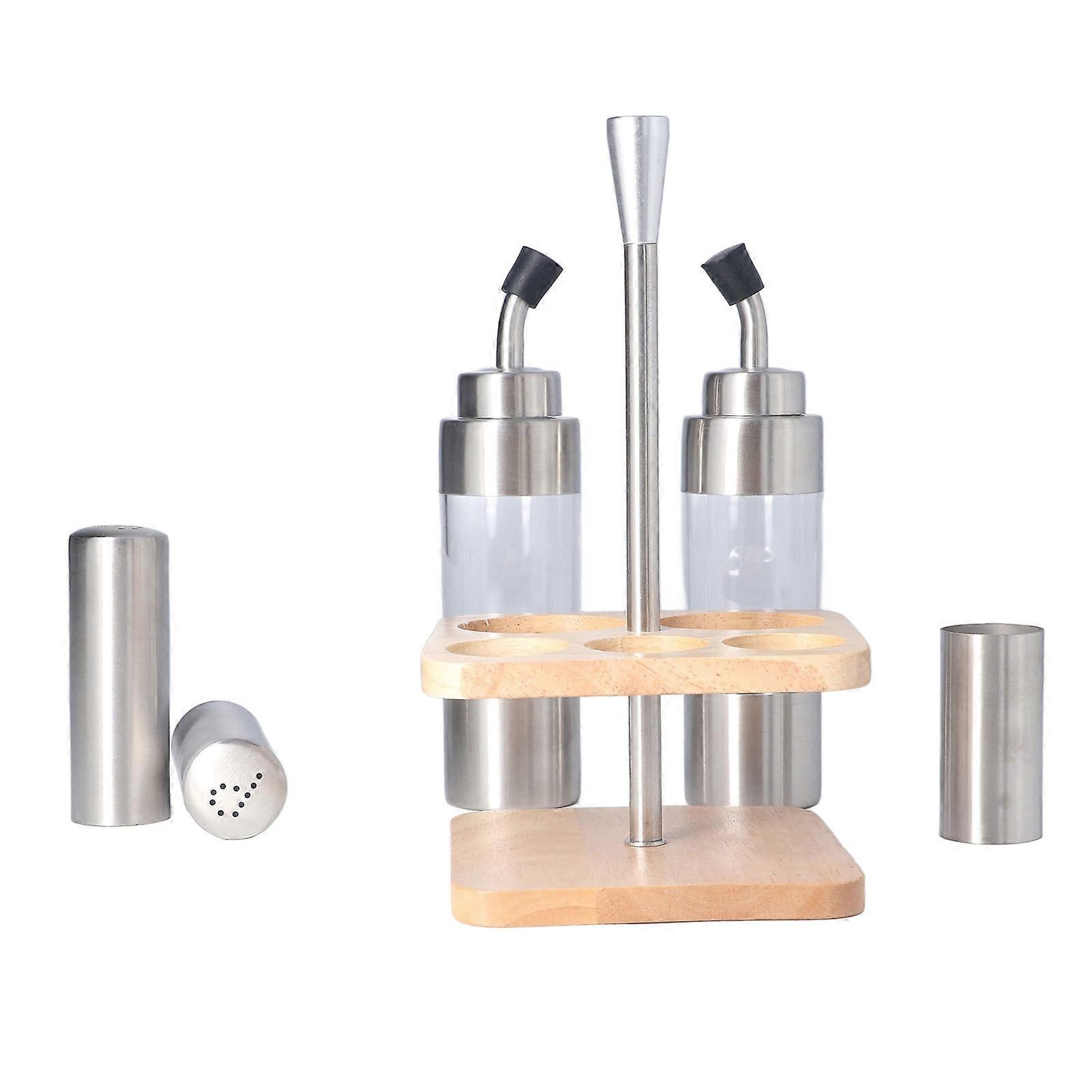 Seasoning Bottle Set with Wooden Rack 304 Stainless Steel Kitchen Table Seasoning Bottle Holder for Oil Salt Soy Sauce