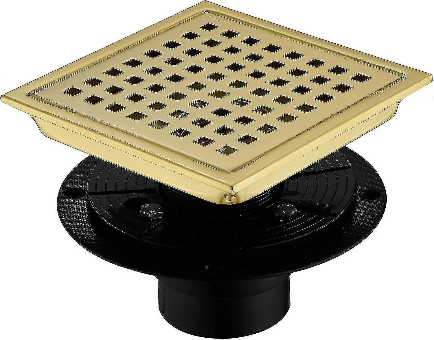 6-Inch Square Shower Drain with Adjustable Base Flange - Brushed Gold SUS 304 Stainless Steel Floor Drain & Removable Cover Grid Grate