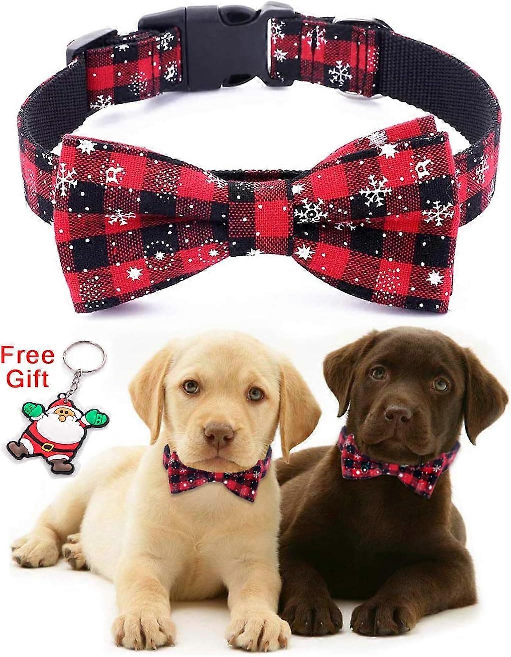 Manufacturedin quality cottonsuperior and 100% nylon.Suitable for small, medium and large dogs. Practical: easy to useput and agrave;remove thanks tothe plastic buckle;D ring made of metal alloy, the D rings are welded for great strength and durability, it is comfortable for your pet. Commitment to quality: We never use harsh chemicals or dyes on our collar. Please refer to:our size chart to measure your dog's neck size.Dimensions can be adjusted within the appropriate range before placing an order Ideal gift: This uniquely designed bow tie is your best gift for your favorite pet.There is a Santa Claus key ring inside.inside the package, hope you can enjoy our gift.