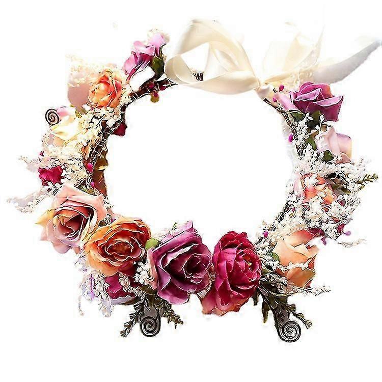 Adjustable Flower Headband Hair Wreath Floral Garland Crown Halo Headpiece with Ribbon Boho Wedding Festival,27*24cm