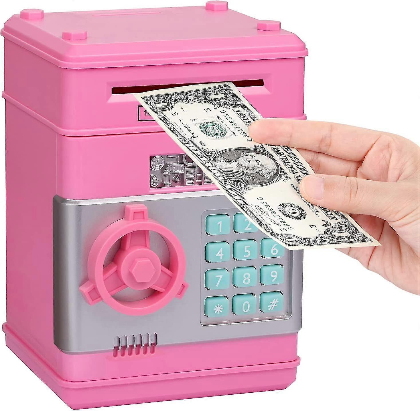 Safe Strong MaterialsThe kids piggy bank made of high-quality environmental ABS plastic, non-toxic and sturdy. Quality electronic coin bank is the best Christmas and birthday gift for age 3 4 5 6 7 8 9 10 boys girls. This money bank will help your childrenlearn how to protect their personal things. Automatic Paper Money ScrollInsert the paper money into the slot on top of the ATM bank, it can be rolled into the slot machine automatically. Very easy for kids to use. (But it doesn't work if the paper is too old or too soft). Educational Fun ATM MachineChildren can create their secret password and show you how it plays after received alcancas. and the function of Auto Scroll Paper Money is so fun. Such fun learning money-saving bank, develop your kid's money-saving concept,cultivate the good habit of saving. Password ProtectionIf you press the wrong password, it will make a sound. If you forget the code and need to reset it, just need to remove the batteries for more than 30 minutes. High Storage Capacitykids money bank can store 600 pieces of coins or 100 pieces of paper money. Batteries: 3 x AA batteries(not included). Protect kid's personal cool stuff. cajero automatico personal will be one of the childrens favorite toys. Surprise Gift IdeaUnisex gifts for kids adults under 30 dollars. Surprise presents for toddler teens boys girls on birthday, Christmas, Halloween, Thanksgiving, New Year, reward, or other holidays. warm Tips: 1. lf you do not use it for more than a week, please remove the battery. 2.1f the battery is insufficient, maybe money can't be rolled in or the door cant open.So please change the new battery frt when you metsuch asituation. 3.Atm machine can store 600 pieces of coins or 100 pieces of paper money .lf exceed the capacity the next money will not be roled in orstuck. soplease notice max capacity. 4.If you forget the password, please take out the battery of the saving bank, then reinstall the bttery after 30 minutes, the code il be reset to theinitial password "00O0".