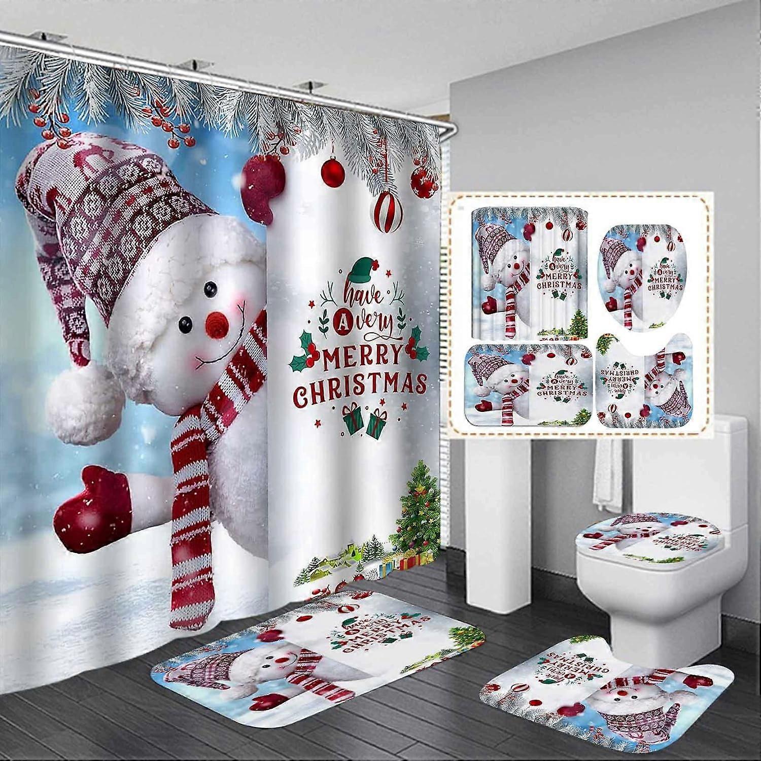 Red Farm Truck Shower Curtain Set, Poinsettia Xmas Rustic Farmhouse Decor, Waterproof Beige Curtain & Non-Slip Bath Mat (4PCS)