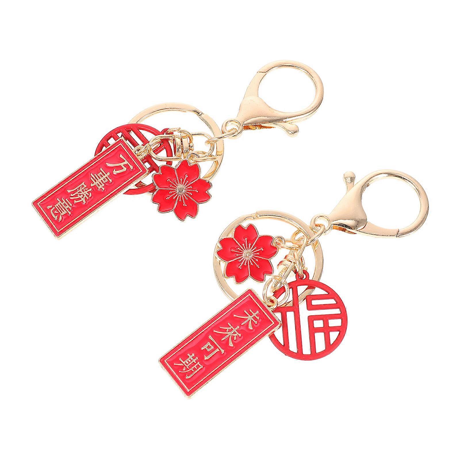 Creative Chinese Style Metal Keychains with Red Flower and Lucky Text Pendants for Bags, Students, and Friends