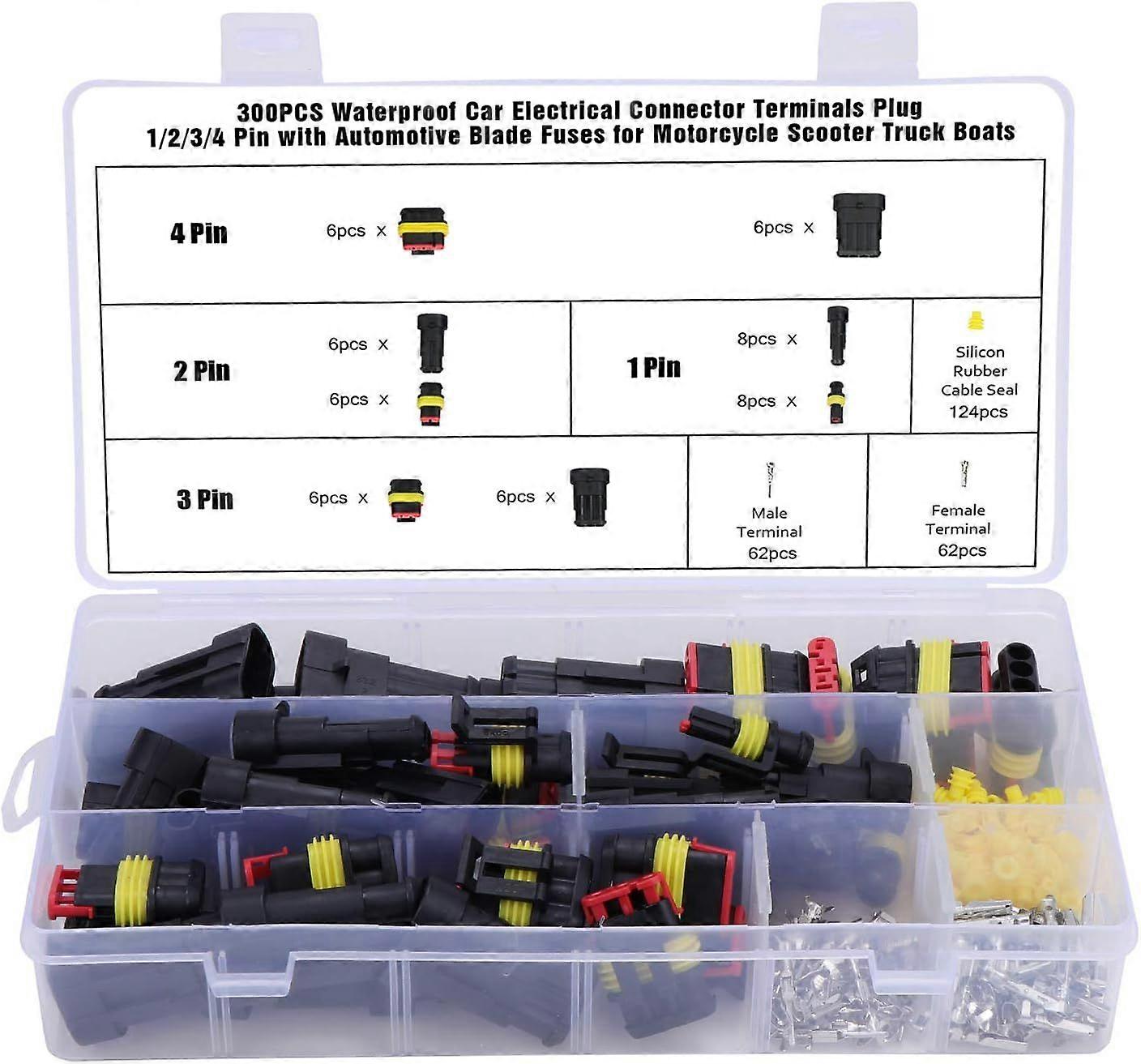 300PCS set. 1, 2, 3 and 4 pin waterproof electrical wire connector sets. Top quality. Made of high quality environmentally friendly materials, with high chemical stability, electrical conductivity and oxidation resistance, electric system with waterproof and dustproof detection performance requirement, safe. Connection terminals. Use high-precision copper plating process to improve conductivity, easy to install under soldering and crimping, colored fuses for easy recognition, protect your car and electrical appliances from short circuit and overload. Easy to install. The buckle design ensures precise and complete insertion of the contact into the housing and prevents it from slipping out of the connector. It can also be removed easily when needed. Wide applications. Suitable for various wire connectors of motorcycle, scooter, car, truck, quad, caravan, marine, jet ski, boats. Product Description Safe, reliable, high-speed connection pressure, not loose, light. Ideal for motorcycle, scooter, car, truck, caravan, marine, jet ski, boats etc. Package includes: 1 pin set of waterproof connectors: 8 x 1-pin male connector housing and insert; 8 x 1-pin female connector housing and insert Waterproof 2-pin connector assembly: 6 x Two-pin male connector housing and insert 6 x Two-pin female connector housing and insert 3-pin waterproof connector assembly 6 x Three-pin male connector housing and insert 6 x Three-pin female connector Waterproof 4-pin connector assembly 6 x four pin male connector housing and insert 6 x four pin female connector 124pcs silicon rubber cable gasket 62 x male terminal 62 x female terminals