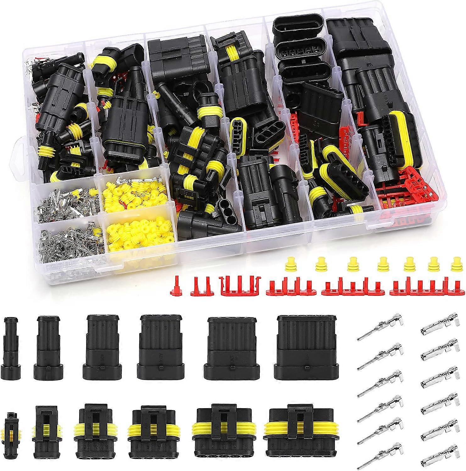 [708PCS Electrical Connector Kit]Package included: 1-Pin, 2-Pin, 3-Pin, 4-Pin, 5-Pin and 6-Pin way automotive super sealed waterproof car electrical connector sets with male and female terminal, and rubber wire seal. The large capacity set is also an irreplaceable wire connection tool whether it is for daily personal use or for workshop. [Durable and Watertight] IP68 grade watertight electrical plugs and connectors features high pressure, light weight, and stable connection, no looseness and slip. Good waterproof performance, can be used in wet or rainy environment. Meanwhile, its sturdiness ensures that it will not broke easily providing you with long term use. [Buckle design]Buckle design with raised rubber lines for increase friction and playing a great watertight effect, ensures stable structure, make it accurate and complete inserting to the contact in the housing, not easy slip out from the connector, which can provide you with a stable and safe support for wire connection. Very easy to plug, and it can also be easily removed when necessary. [Wide Application] car electrical connectors kit is great for motorcycle, scooter, car, truck, quad bike, caravan, marine, jet ski and boats, etc. Come with a transparent case for easy access and storage. [Ideal Gift]Surprise your Husband, Dad, Son, Boyfriend, Brother, your friend, co-worker or Boss and also best gift for Christmas, Birthday, Fathers Day, Anniversary, Graduation. Specification Material: Plastic+Ruber Suitable for1.5mm terminal Colour: As Picture Waterproof Grade: IP68 Rated Voltage: 300V Rated current: 12A Operating temperature: -25~85 Includes 6 kinds of pin type: 1/2/3/4/5/6 pins Storage Case Size: 27.5x17.6x4.5cm/10.83x6.93x1.77inch Package Included 1-Pin: (10 Sets) 10 x Male Housing Connectors 10 x Female Housing Connectors 2-Pin: (8 Sets) 8 x Male Housing Connectors 8 x Female Housing Connectors 3-Pin: (8 Sets) 8 x Male Housing Connectors 8 x Female Housing Connectors 4-Pin: (6 Sets) 6 x Male Housing Connectors 6 x Female Housing Connectors 5-Pin: (6 Sets) 6 x Male Housing Connectors 6 x Female Housing Connectors 6-Pin: (5 Sets) 5 x Male Housing Connectors 5 x Female Housing Connectors 134 x Male Terminal 134 x Female Terminal 268 x Silicon Rubber Cable Seal