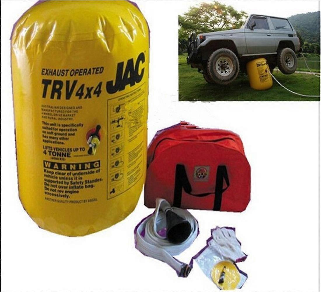 Getting a flat tyre or becoming stuck in the ground while youre driving isnt ideal. Poor weather conditions can make this frustrating event even more miserable. Equip yourself with the tools to quickly get yourself back on the road with this handy set. This air jack is perfect for getting your car back on the road when youre stuck in the middle of nowhere. It easily inflates by connecting to your vehicles exhaust. Youll quickly and reliably raise your vehicle out of any sticky situation; snow, mud, sand, soft ground, and sloping ground will be no problem for your car. Plus, changing the spare tyre in is a breeze with this easy to operate unit. Never risk the enjoyment of your next trip by getting stuck for hours on the side of the road, buy this fantastic kit today and youll always be equipped to deal with any roadside problems. Features: A car essential for all tripsInflation possible through exhaustSafely lift your vehicle up out of a rut or bogPerfect in sand, mud, soft ground, or snowPerfect for easily replacing a tyreAnti-slip ground spikes6m exhaust hostDurable carry and accessory bag includedLifts up to 4 tonnes Specifications: Material: PVC Nylon polyesterWeight Capacity: 4 TonHose Length: 513cmExtension hose length: 104cmMat size (L x W): 76 x 65cmProduct Dimension (Dia. x H): 65 x 78cmPackage Dimension (L x W x H): 46 x 36 x 22cmGross weight: 7kg Package Contents: 1 x Vehicle 4 Tonne Exhaust Air Jack1 x hose1 x extension hosePair of gloves2 x protective matsBottle of 10ml adhesive1 x portable bag2 x yellow round mats1 x accessory