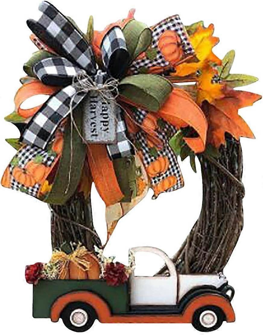 Farmhouse Vintage Pumpkin Truck Wreath, Take the Harvest Home Creative Happy Harvest Fall Wreath Front Door Hanging Ornament Natural Decoration (D-4-)