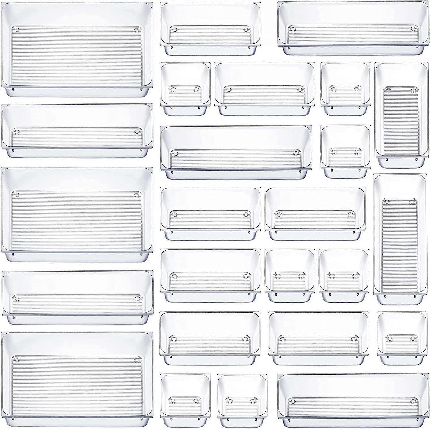 Clear Plastic Drawer Organizers Set, 4-Size Versatile Bathroom and Vanity Drawer Organizer Trays, Storage Bins for Makeup, Bedroom, Kitchen Gadgets Ut