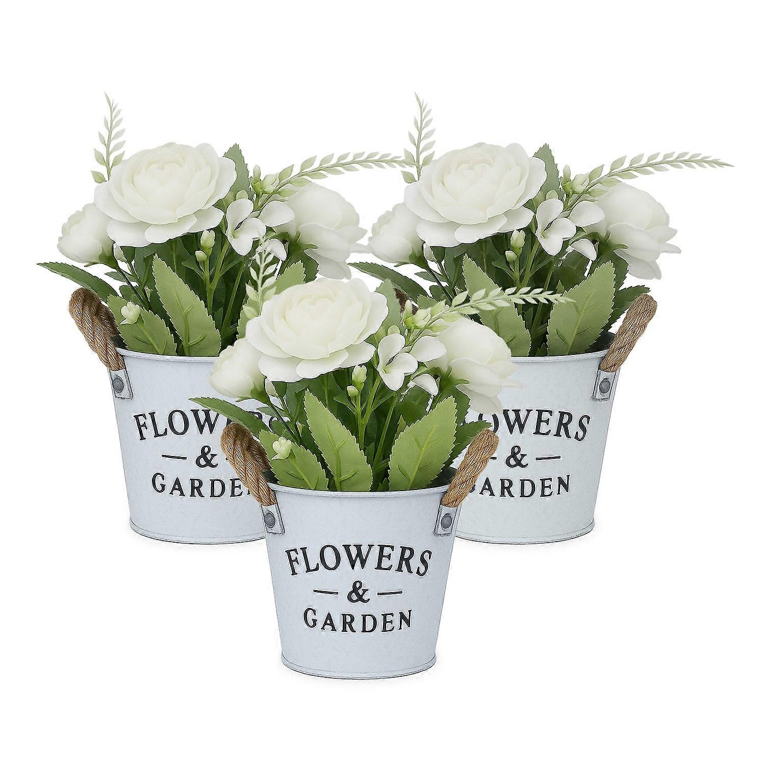 Set med konstgjorda blommor, 3 vita krukor med rephandtag