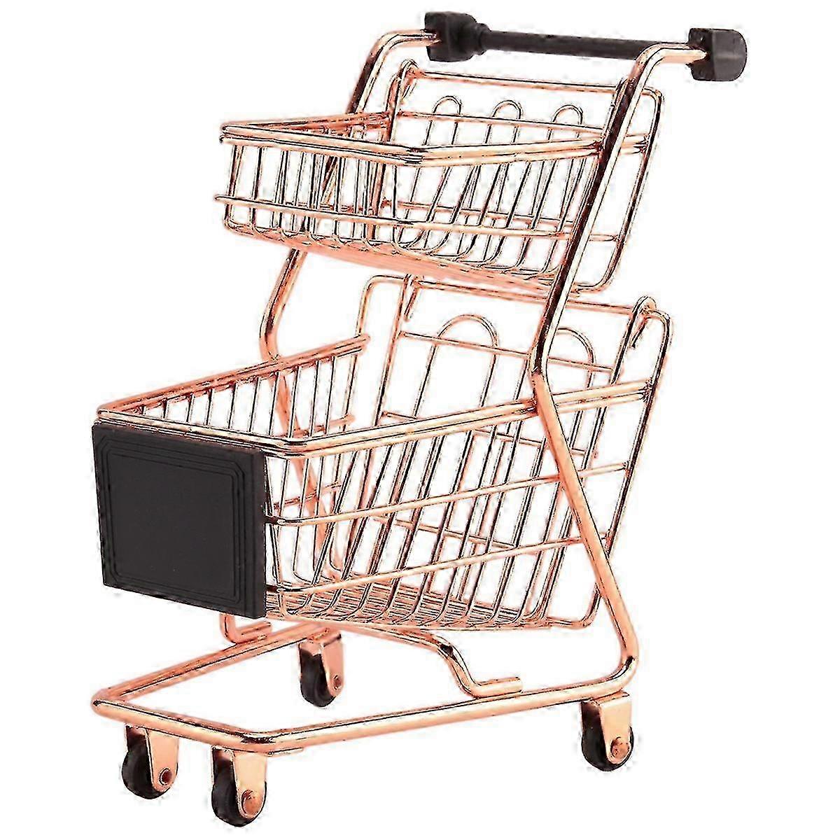Mini Double-Layer Shopping Cart Model with Wrought Iron Frame, Rose Gold Metal Basket for Supermarket Trolley Storage