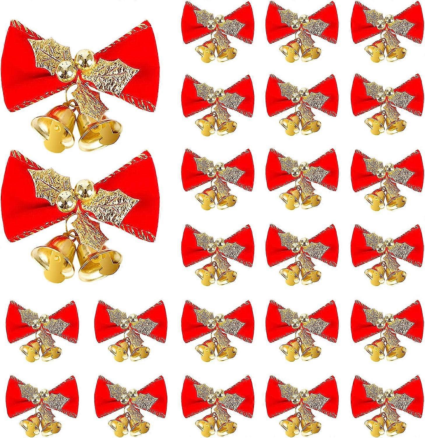 Christmas Bow with Bells Mini Bowknot Ornament Xmas Wreaths Bows Craft Ribbon Bow Christmas Tree Hanging Decorationred, gold24 Pieces