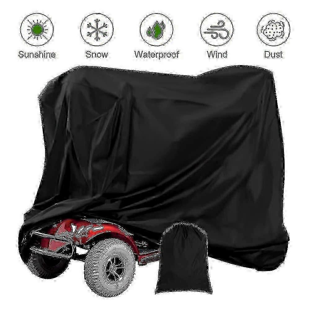 High-quality MaterialsThe mobility scooter cover is made of high quality 190D Oxford which is waterproof and wear resistant; It has good resistance of heat, moisture and tear, easy to clean and easy to attach. and can be used for long time.Waterproof & UV Protection DesignOxford waterproof hood provides quick and easy protection for your scooter, can effectively keep your scooter dry even in heavy rainstorm, protects against rain, dust,dirt,birds and tree sap. You don't have to worry about getting the car wet when it rains. The protective case protects your scooter from the sun. Avoid long-term exposure to sunlight and fade and burn.Universal Size for Most Mobility ScootersUniversal fits scooters up to size . Suitable for most 4 wheeled electric mobility scooter. Coming with a portable bag for storage, you can easily foldable the mobility scooter storage cover and storage it. Easy to wash and dry. So you don't have to worry that it's hard to clean after it gets dirty.Easy To InstallThis mobility scooter covers comes with a strong drawstring cord at bottom,you can tight the drawstring as per your request,it will secure your cover no flapping about in the high winds.it will be very easy to open and close, while using portable materials to make it easy for you to install.All Weather ProtectionOur mobility scooter covers for outside storage can protect against the effects of adverse weather conditions,completely withst rain, wind, sun, snow, pollen, birds, dust, dirt, wet Leaves & more,fit for all year around.it will provide the best protection when you don't need it, make sure your scooter do not suffer a trace of damage.