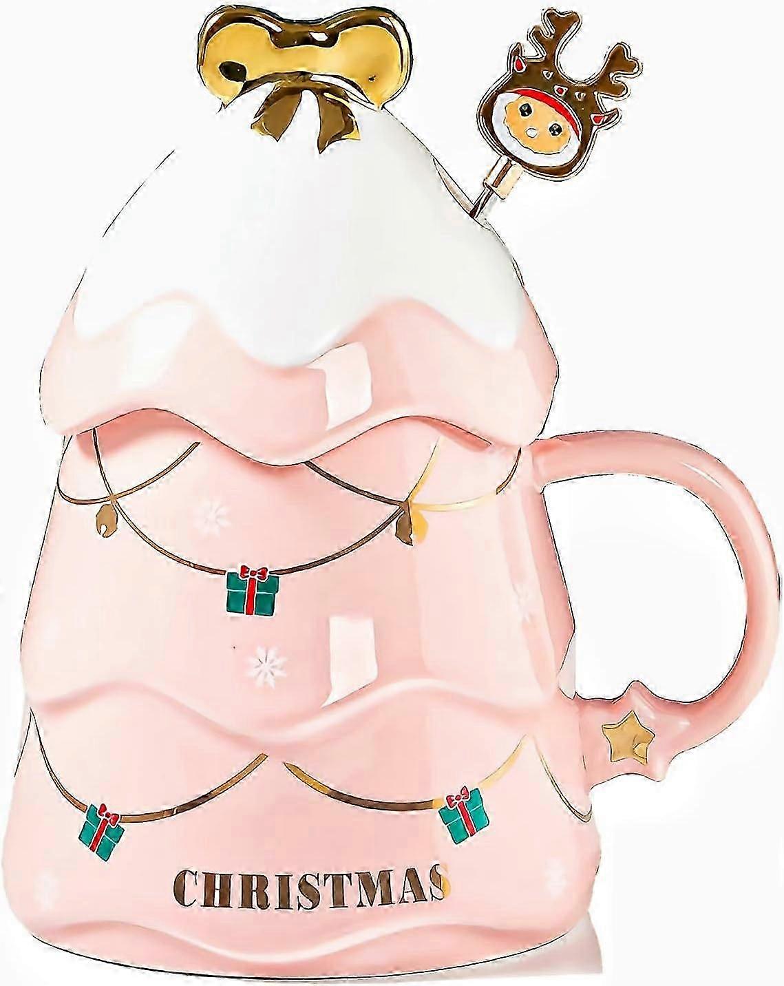 Christmas Ceramic Mug with Snow Lid and Stirrer - 17 oz Tree Shape Cup for Coffee and Milk