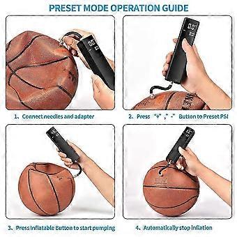 [Automatic Electric Ball Pump]Electric Ball Pump designs with intelligent pressure detection and stop function,just preset the correct ball PSI,press to start and it will automatically stop inflating once the preset pressure is reached. Smart and easy to use.[Fast Ball Pump-Free Your Hands and Save Your Energy]Air volume input: 4L/M, which finishes inflation of a ball in just 1-2 minutes. No need to be sweating for pushing or pulling those manual ball pumps with your hands. Saving more energy to beat your opponent.[Accurate Pressure Alignment] built-in Digital Pressure Gauge and LCD Display, you can preset a very accurate PSI to inflate your ball ,and then you could get an accurate level of pressure (PSI) in balls. Makes inflating balls much easier without wasting time, you can focus, not on the ball but, on the game.[High-capacity Battery]Electric ball pump with 2000mAh rechargeable battery, inflate 30 balls on one charge, come with -USB charging cable, about 120 minutes to full charged.[Portable Compact Design]fit to in your bag, your boot or even your pocket. Allows you to take this mini pump to wherever you might need it to keep your balls inflated.With bright LED lights and backlight LCD display make it convenient to use the ball pump at night or in dark places.Colour:blackMaterial:Aluminum alloyPackage Contents:1 * Smart Ball Pump1 * USB Cable1 * 10 cm Air Hose2 * Ball Needle1 * Swim Ring NozzleOnly the above package content, other products are not included.Note: Light and different displays may cause the color of the item in the picture a little different from the real thing. The measurement allowed error is +/- 1-3cm.