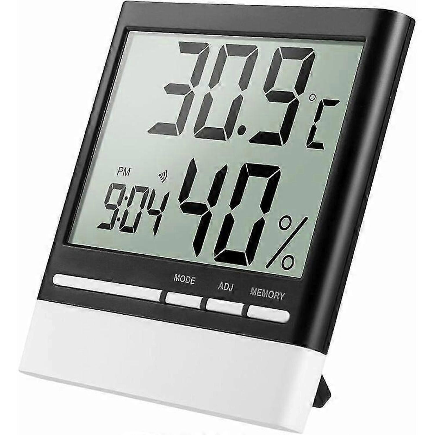 NEW DESIGN, GOOD FOR YOUR HEALTH - The thermo-hygrometer measures indoor temperature (in Fahrenheit/Celsius) and humidity with precise sensors, and helps you adjust your humidifier and dehumidifier, to monitor living conditions in the room and the health of your family by avoiding the risk of colds, dry skin, asthma, and mold. HIGH STABILITY PRECISION LOW POWER CONSUMPTION Fast real-time measurement. Displays temperature and humidity levels clearly and clearly, so you can obtain accurate measurement with this device. Low power consumption. EASY READING OPERATION The thermometer and hygrometer; is not complicated to use (measurement in degrees Celsius or Fahrenheit adjustable), with a front with a readable LCD screen and a bright rear, large inscriptions, and a large screen, for easy reading even from a distance. Note: Please remove the protective plastic film for better use. VARIOUS MOUNTING OPTIONS - Temperature and humidity meter with a tripod for standing on a table, or with hooks for hanging on a wall, so the device can blend into any environment, (such as a bathroom music, child, a basement, a greenhouse...) Functions: 1.Display of the interior temperature 2.Display of the interior humidity 3.Temperature adjustable in degree or 4.Memory of MAX values / MIN of temperature and humidity 5.Two time display modes: 12h/24h 6.Hourly alarm function 7.Daily alarm function Attention: 1. Press the [ button once RESET] when the device is used for the first time or the battery has been replaced. 2. Press the [RESET] button once if an abnormal display occurs. 3. Dispose of used batteries according to applicable laws.